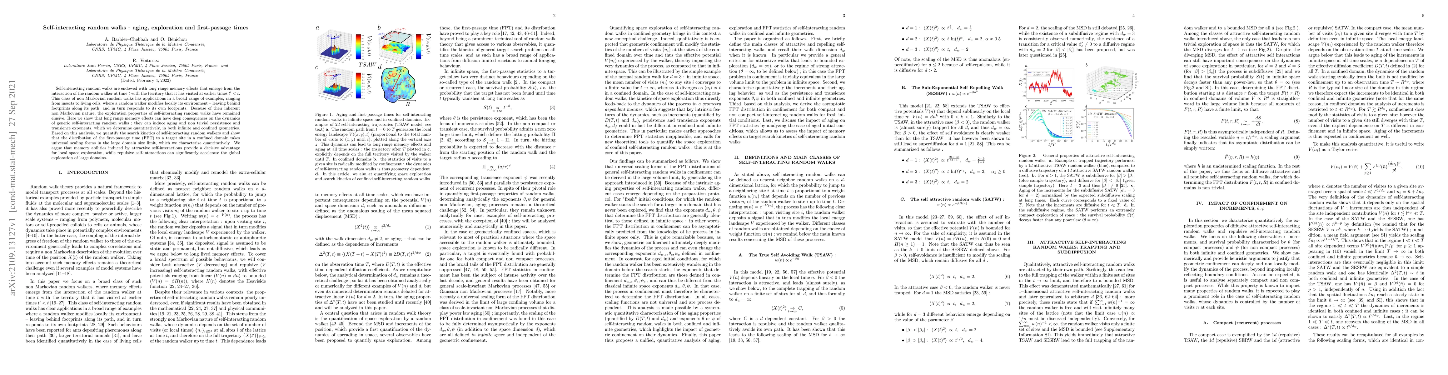 This paper explores self-interacting random walks, revealing how long-range memory effects induce aging and non-trivial persistence and transience exponents. It quantifies the search kinetics and first-passage time distribution, showing universal scaling forms in large confined domains, and argues that self-interactions enhance both local and global exploration efficiency.