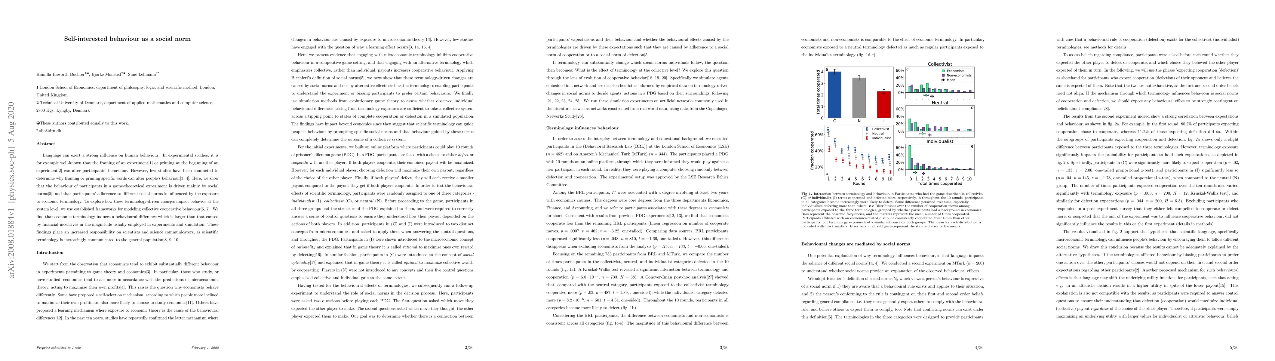 Language can exert a strong influence on human behaviour. In experimental studies, it is for example well-known that the framing of an experiment or priming at the beginning of an experiment can alter participants' behaviour. However, few studies have been conducted to determine why framing or priming specific words can alter people's behaviour. Here, we show that the behaviour of participants in a game-theoretical experiment is driven mainly by social norms, and that participants' adherence to different social norms is influenced by the exposure to economic terminology. To explore how these terminology-driven changes impact behavior at the system level, we use established frameworks for modeling collective cooperative behaviour. We find that economic terminology induces a behavioural difference which is larger than that caused by financial incentives in the magnitude usually employed in experiments and simulation. These findings place an increased responsibility on scientists and science communicators, as scientific terminology is increasingly communicated to the general population.