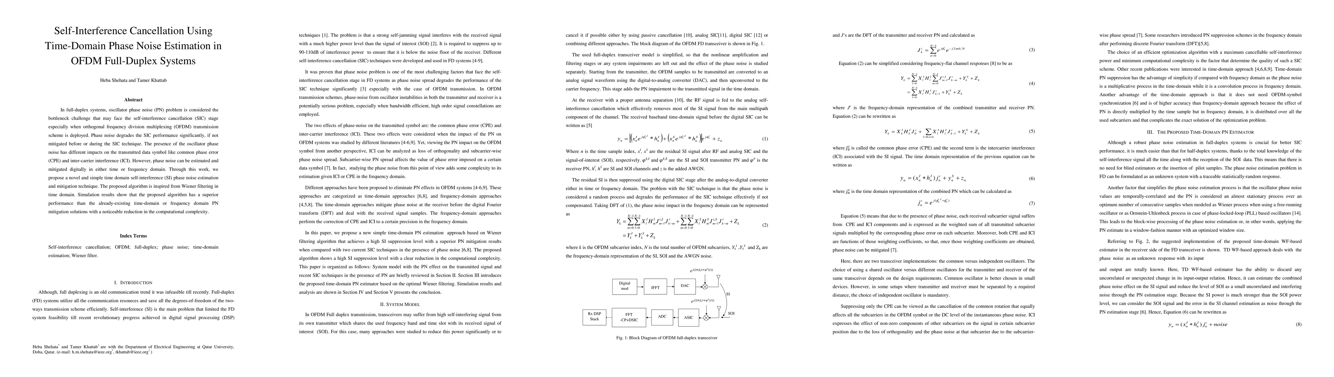This paper proposes a novel time-domain phase noise estimation and mitigation technique for self-interference cancellation in OFDM full-duplex systems, inspired by Wiener filtering. The method significantly outperforms existing solutions in performance and reduces computational complexity.