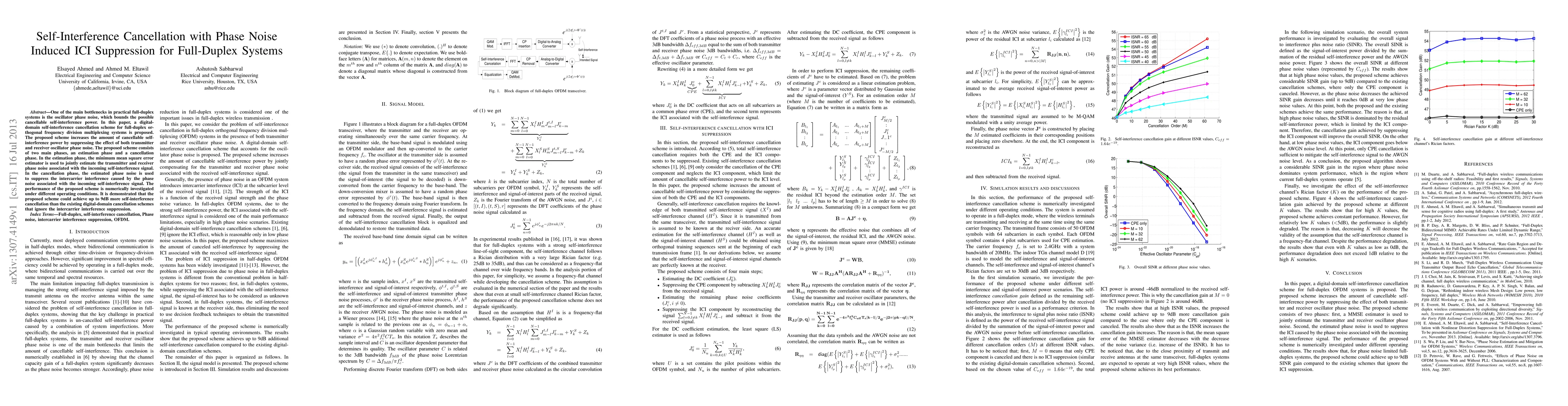 This paper proposes a self-interference cancellation scheme for full-duplex systems that suppresses the effect of phase noise to enhance cancellable self-interference power, achieving up to 9dB more cancellation than existing methods. The scheme includes an estimation phase to jointly estimate phase noise and a cancellation phase to mitigate intercarrier interference.