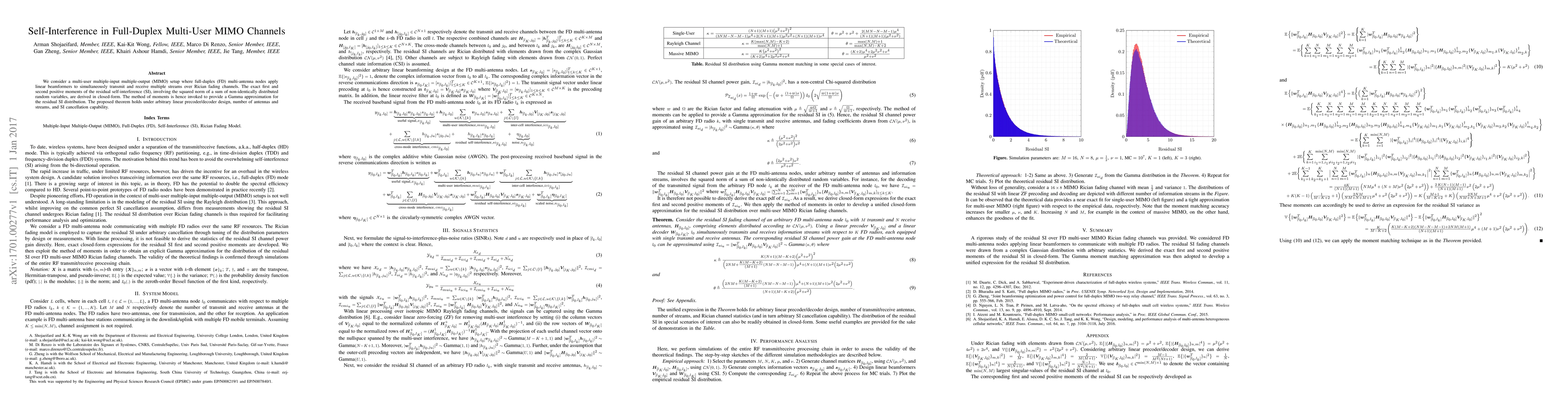 Researchers derived closed-form expressions for the first and second positive moments of residual self-interference in full-duplex multi-user MIMO channels, providing a Gamma approximation for the distribution of residual SI.