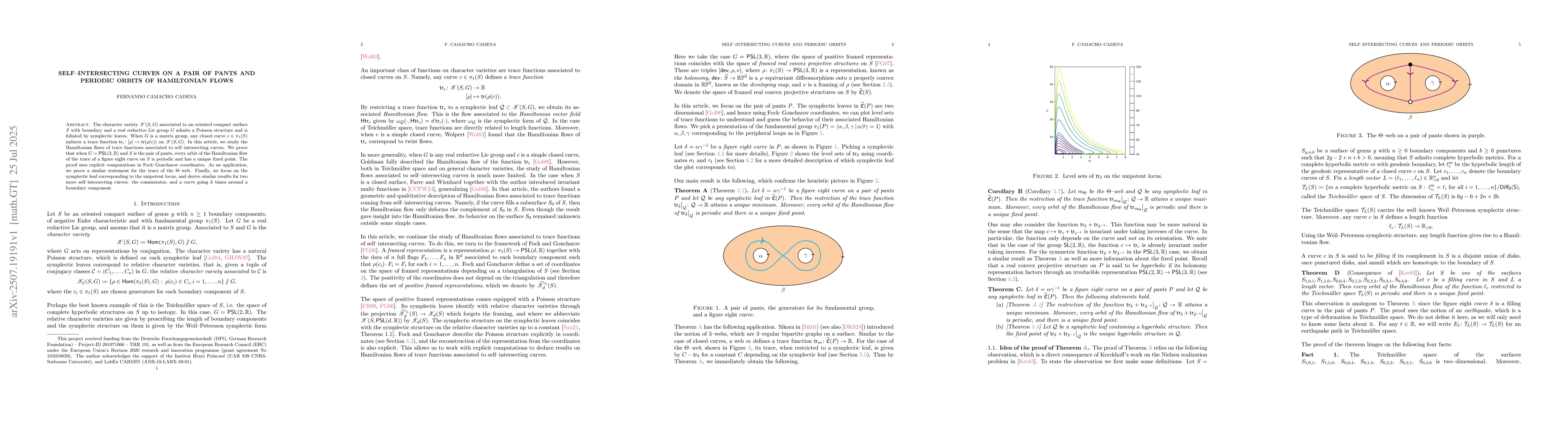 The character variety $\mathscr{X}(S,G)$ associated to an oriented compact surface $S$ with boundary and a real reductive Lie group $G$ admits a Poisson structure and is foliated by symplectic leaves. When $G$ is a matrix group, any closed curve $c\in\pi_1(S)$ induces a trace function $\mathsf{tr}_c\colon[\rho]\mapsto \mathsf{tr}(\rho(c))$ on $\mathscr{X}(S,G)$. In this article, we study the Hamiltonian flows of trace functions associated to self-intersecting curves. We prove that when $G=\mathsf{PSL}(3,\mathbb{R})$ and $S$ is the pair of pants, every orbit of the Hamiltonian flow of the trace of a figure eight curve on $S$ is periodic and has a unique fixed point. The proof uses explicit computations in Fock-Goncharov coordinates. As an application, we prove a similar statement for the trace of the $\Theta$-web. Finally, we focus on the symplectic leaf corresponding to the unipotent locus, and derive similar results for two more self-intersecting curves: the commutator, and a curve going $k$ times around a boundary component.