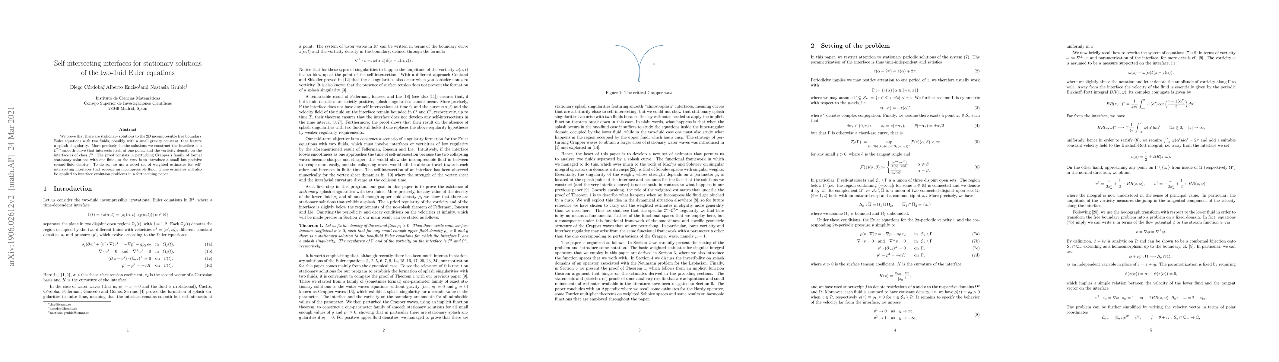 We prove that there are stationary solutions to the 2D incompressible free boundary Euler equations with two fluids, possibly with a small gravity constant, that feature a splash singularity. More precisely, in the solutions we construct the interface is a $C^{2,\alpha}$ smooth curve that intersects itself at one point, and the vorticity density on the interface is of class $C^\alpha$. The proof consists in perturbing Crapper's family of formal stationary solutions with one fluid, so the crux is to introduce a small but positive second-fluid density. To do so, we use a novel set of weighted estimates for self-intersecting interfaces that squeeze an incompressible fluid. These estimates will also be applied to interface evolution problems in a forthcoming paper.