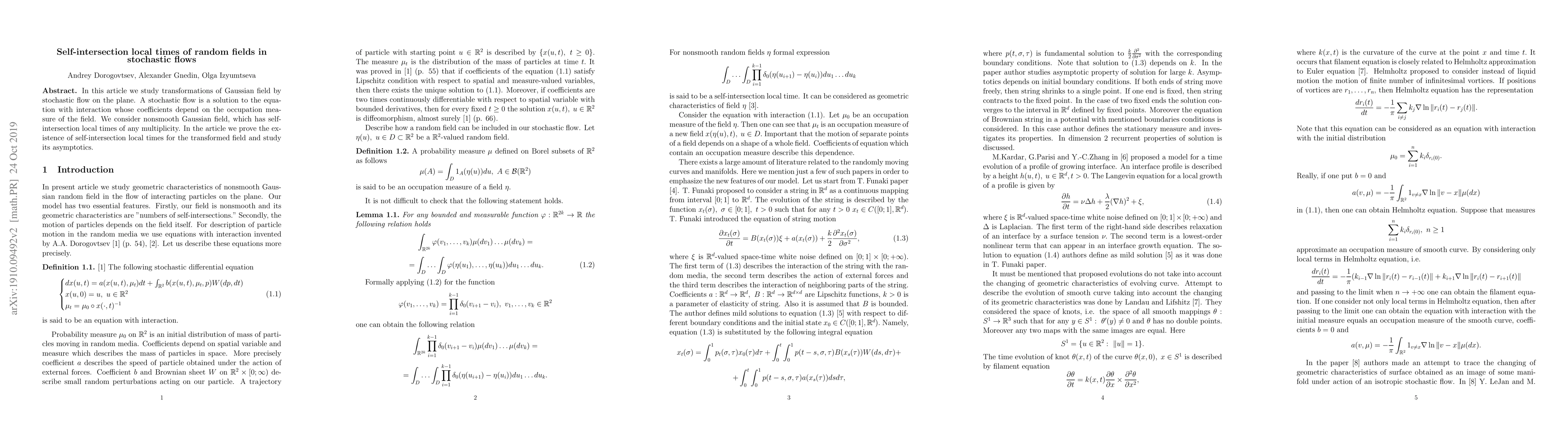In this article we study transformations of Gaussian field by stochastic flow on the plane. A stochastic flow is a solution to the equation with interaction whose coefficients depend on the occupation measure of the field. We consider nonsmooth Gaussian field, which has self-intersection local times of any multiplicity. In the article we prove the existence of self-intersection local times for the transformed field and study its asymptotics.