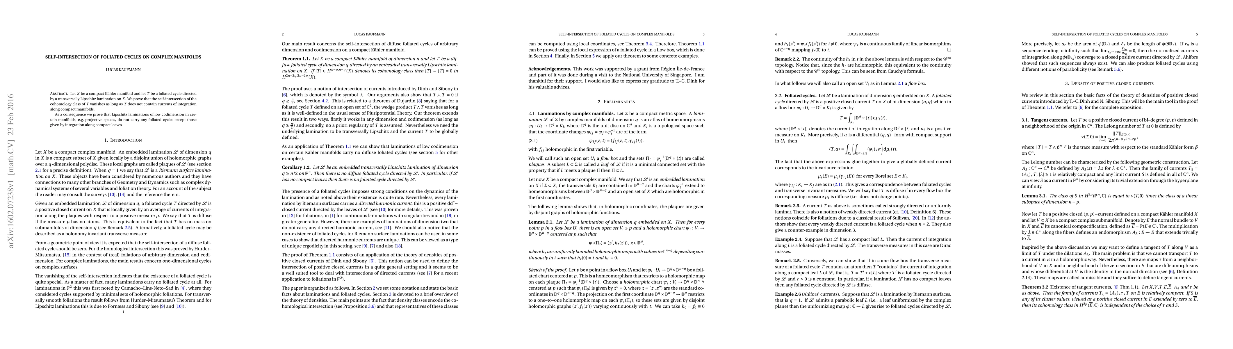 Let X be a compact Kahler manifold and let T be a foliated cycle directed by a transversally Lipschitz lamination on X . We prove that the self-intersection of the cohomology class of T vanishes as long as T does not contain currents of integration along compact manifolds. As a consequence we prove that transversally Lipschitz laminations of low codimension in certain manifolds, e.g. projective spaces, do not carry any foliated cycles except those given by integration along compact leaves.