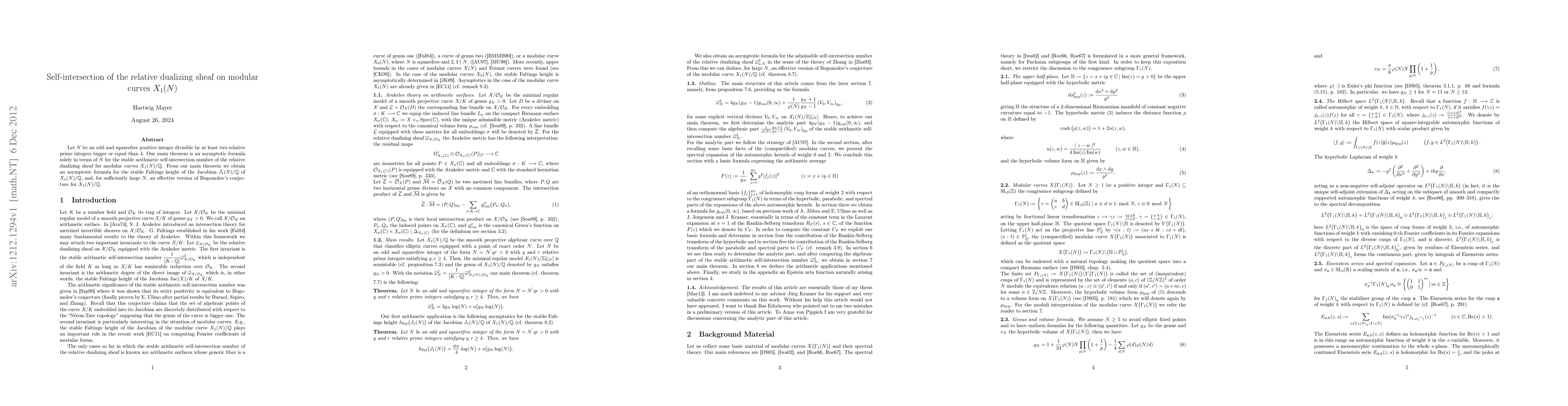 The paper presents an asymptotic formula for the stable arithmetic self-intersection number of the relative dualizing sheaf on modular curves $X_1(N)$ when $N$ is a specific odd, squarefree integer. It also derives consequences including an asymptotic formula for the stable Faltings height of the Jacobian and an effective version of Bogomolov's conjecture for sufficiently large $N$.
