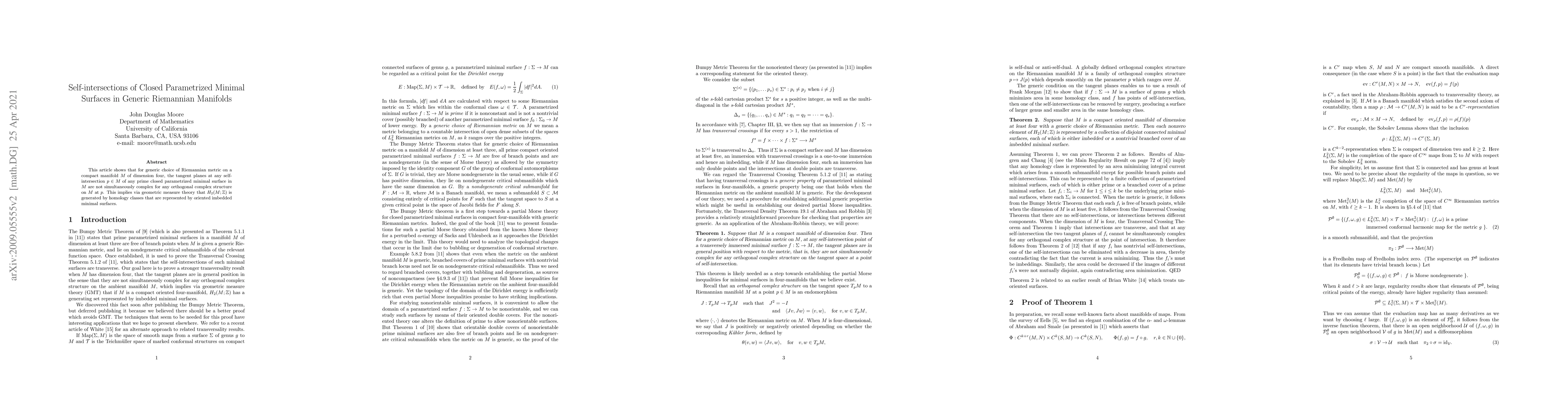 This article shows that for generic choice of Riemannian metric on a smooth manifold $M$ of dimension four, all prime compact parametrized minimal surfaces within $M$ have self-intersections in general position in the following sense: self-intersections are transverse and the two tangent planes at any self-intersection point fail to be complex with respect to any orthogonal complex structure on the ambient manifold $M$. This implies via a result of Sheldon Chang that $H_2(M;{\mathbb Z})$ is generated by homology classes that are represented by imbedded minimal surfaces.