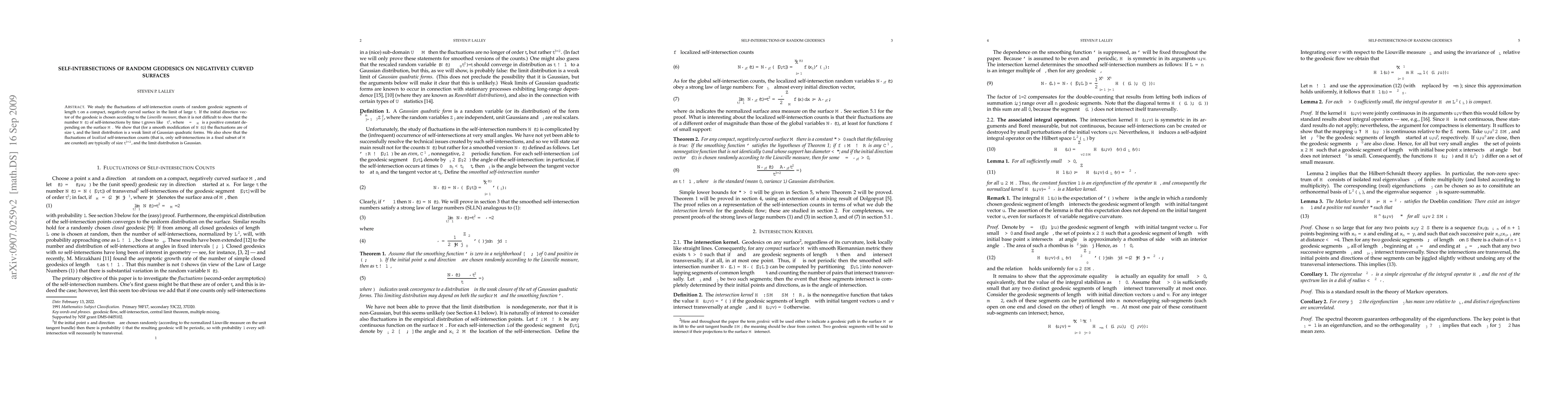 This paper investigates the self-intersection counts of random geodesics on negatively curved surfaces, showing that the number of intersections grows as $\kappa t^{2}$ with $\kappa$ dependent on the surface. It further demonstrates that the fluctuations in these counts are of size $t$ and follow a Gaussian distribution.