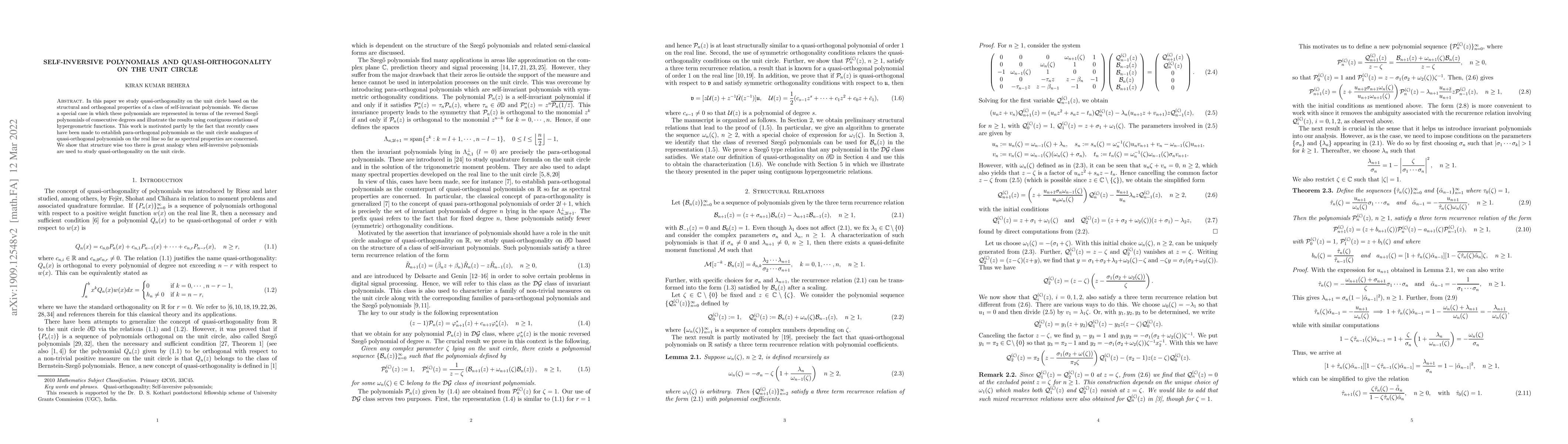 This paper investigates quasi-orthogonality on the unit circle using self-inversive polynomials, specifically examining their structural and orthogonal properties. It demonstrates the analogy between these polynomials and para-orthogonal polynomials on the real line through the use of reversed Szegő polynomials and hypergeometric functions.