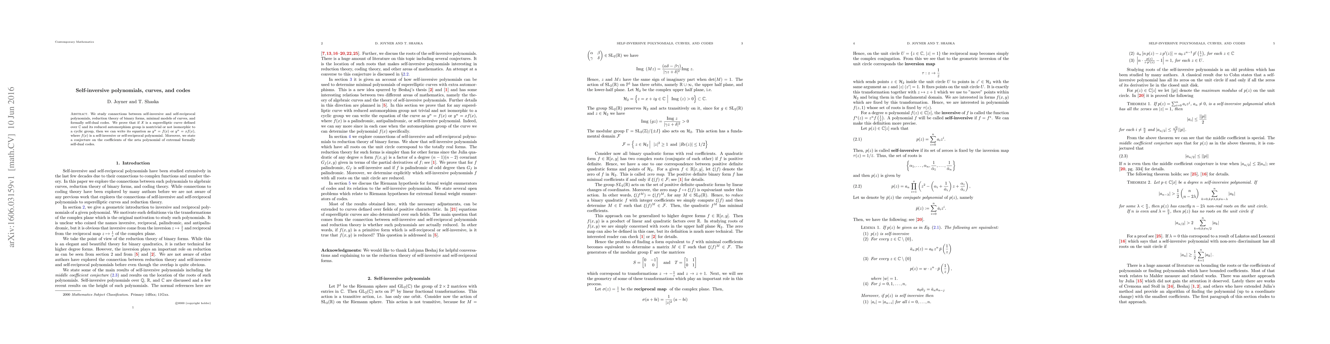 We study connections between self-inversive and self-reciprocal polynomials, reduction theory of binary forms, minimal models of curves, and formally self-dual codes. We prove that if $\mathcal X$ is a superelliptic curve defined over $\mathbb C$ and its reduced automorphism group is nontrivial or not isomorphic to a cyclic group, then we can write its equation as $y^n = f(x)$ or $y^n = x f(x)$, where $f(x)$ is a self-inversive or self-reciprocal polynomial. Moreover, we state a conjecture on the coefficients of the zeta polynomial of extremal formally self-dual codes.