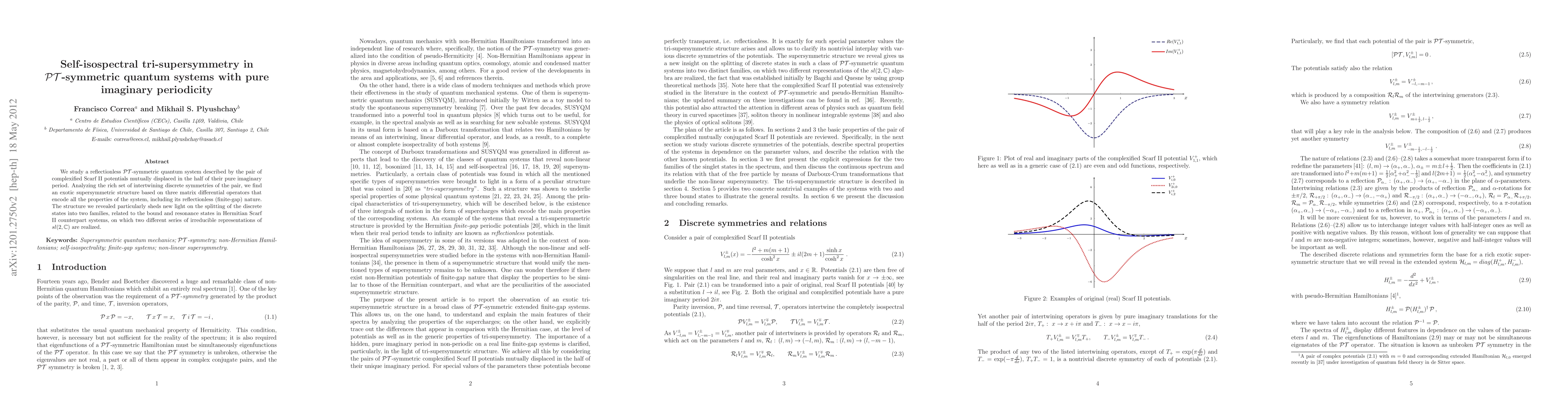 We study a reflectionless PT-symmetric quantum system described by the pair of complexified Scarf II potentials mutually displaced in the half of their pure imaginary period. Analyzing the rich set of intertwining discrete symmetries of the pair, we find an exotic supersymmetric structure based on three matrix differential operators that encode all the properties of the system, including its reflectionless (finite-gap) nature. The structure we revealed particularly sheds new light on the splitting of the discrete states into two families, related to the bound and resonance states in Hermitian Scarf II counterpart systems, on which two different series of irreducible representations of sl(2,C) are realized.