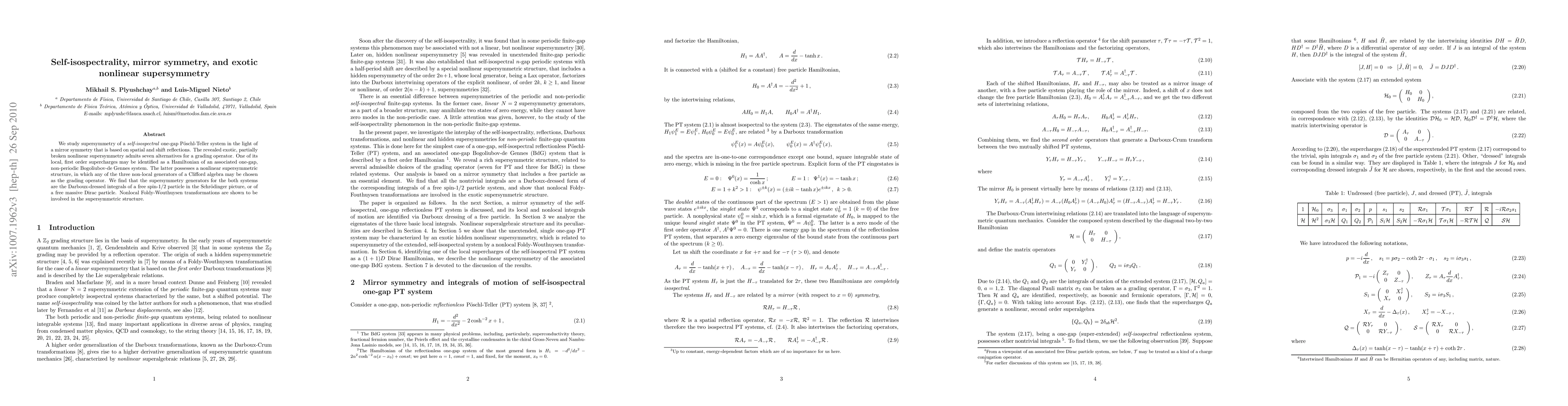 This paper explores the supersymmetry of a self-isospectral one-gap Poschl-Teller system through mirror symmetry, revealing an exotic, partially broken nonlinear supersymmetry with seven grading operator alternatives. It identifies a local supercharge as the Hamiltonian of an associated non-periodic Bogoliubov-de Gennes system, showing nonlocal generators of a Clifford algebra as grading operators.