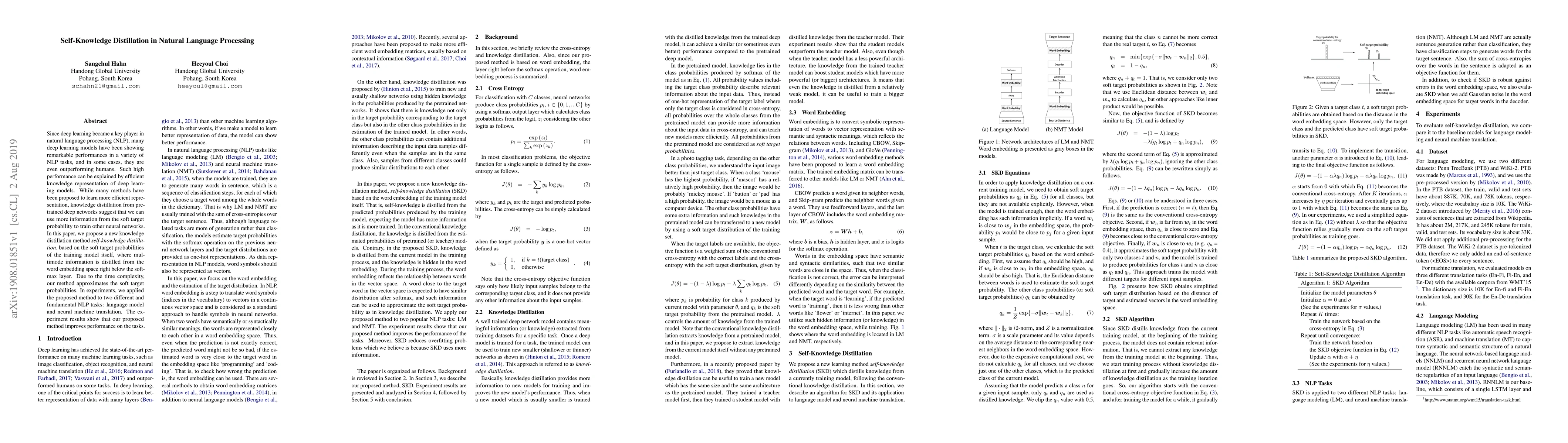 The paper proposes a new knowledge distillation method called self-knowledge distillation (SKD) for natural language processing tasks. SKD distills knowledge from the current training model itself, using soft target probabilities from the word embedding space below the softmax layer. It approximates soft target probabilities due to time complexity and applies this method to language modeling and neural machine translation tasks.
