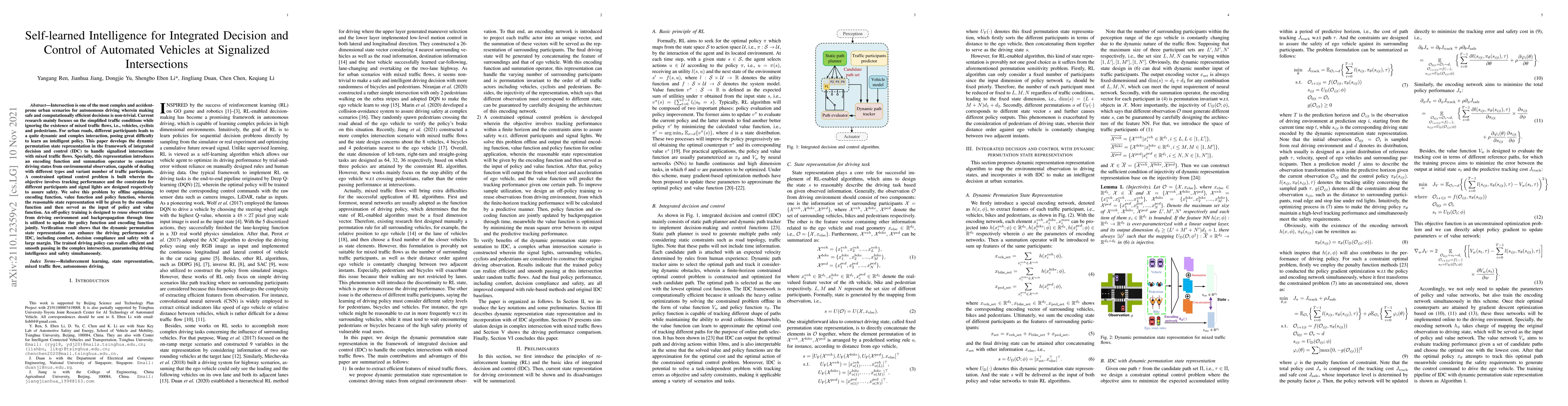 This paper develops a dynamic permutation state representation for integrated decision and control of automated vehicles at signalized intersections, addressing mixed traffic flows. The approach enhances driving performance by optimizing encoding, value, and policy functions, achieving efficient, safe, and compliant navigation.