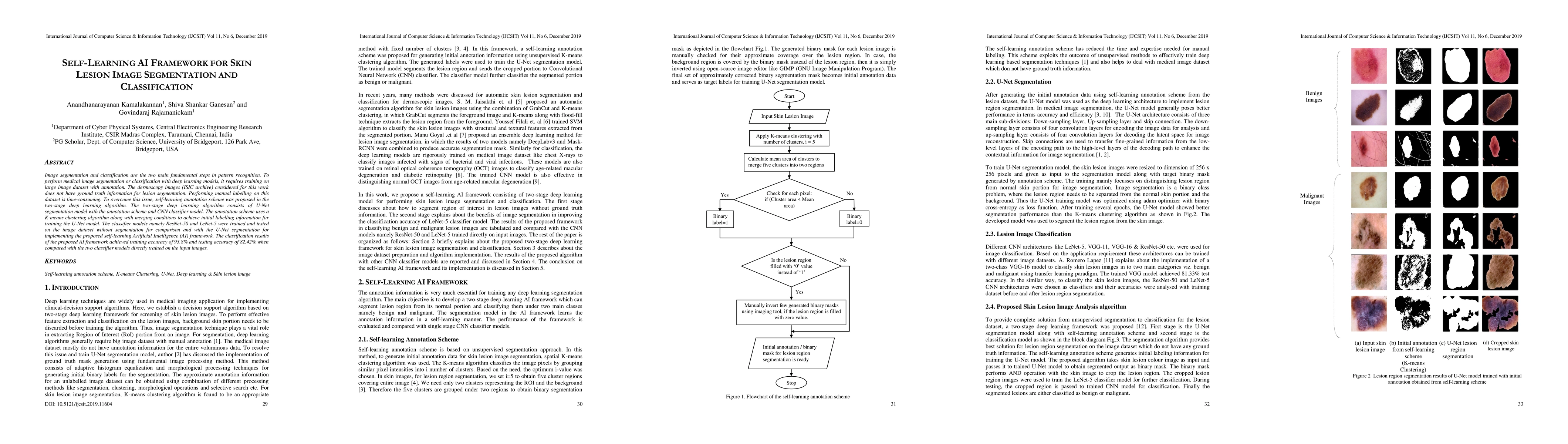 Image segmentation and classification are the two main fundamental steps in pattern recognition. To perform medical image segmentation or classification with deep learning models, it requires training on large image dataset with annotation. The dermoscopy images (ISIC archive) considered for this work does not have ground truth information for lesion segmentation. Performing manual labelling on this dataset is time-consuming. To overcome this issue, self-learning annotation scheme was proposed in the two-stage deep learning algorithm. The two-stage deep learning algorithm consists of U-Net segmentation model with the annotation scheme and CNN classifier model. The annotation scheme uses a K-means clustering algorithm along with merging conditions to achieve initial labelling information for training the U-Net model. The classifier models namely ResNet-50 and LeNet-5 were trained and tested on the image dataset without segmentation for comparison and with the U-Net segmentation for implementing the proposed self-learning Artificial Intelligence (AI) framework. The classification results of the proposed AI framework achieved training accuracy of 93.8% and testing accuracy of 82.42% when compared with the two classifier models directly trained on the input images.