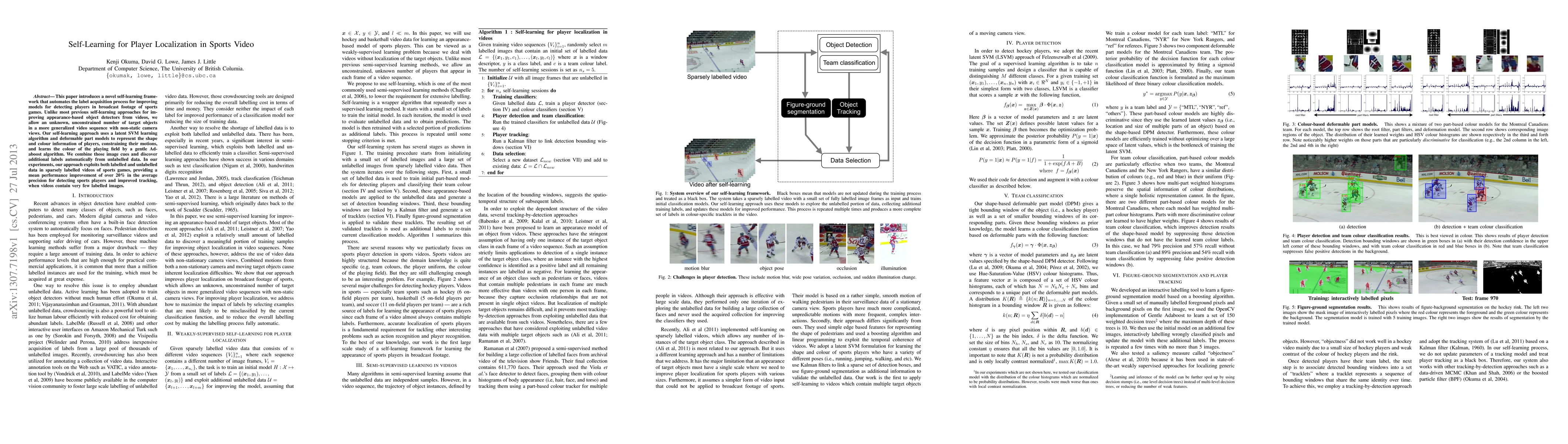 This paper presents a self-learning framework that automates label acquisition for detecting players in sports videos, using latent SVM and deformable part models to handle an unknown number of players and non-static camera views. The approach achieves a 20% improvement in average precision for player detection and tracking.