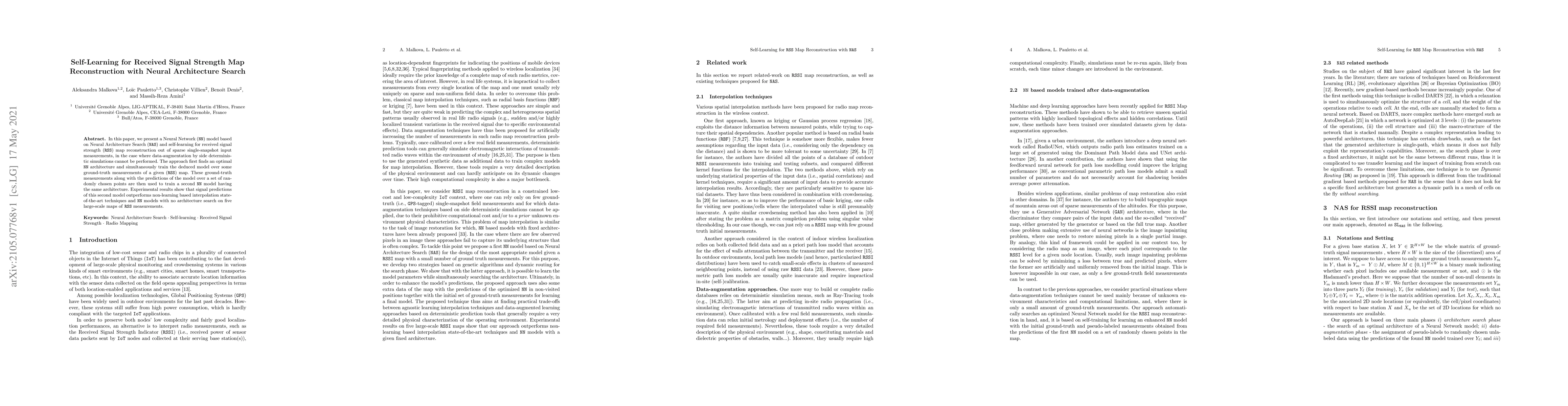 This paper proposes a Neural Network model using Neural Architecture Search (NAS) and self-learning for reconstructing received signal strength (RSS) maps from sparse input measurements. The method optimizes the network architecture and trains it on ground-truth data, then refines the model using self-generated predictions, achieving superior performance compared to non-learning based techniques.
