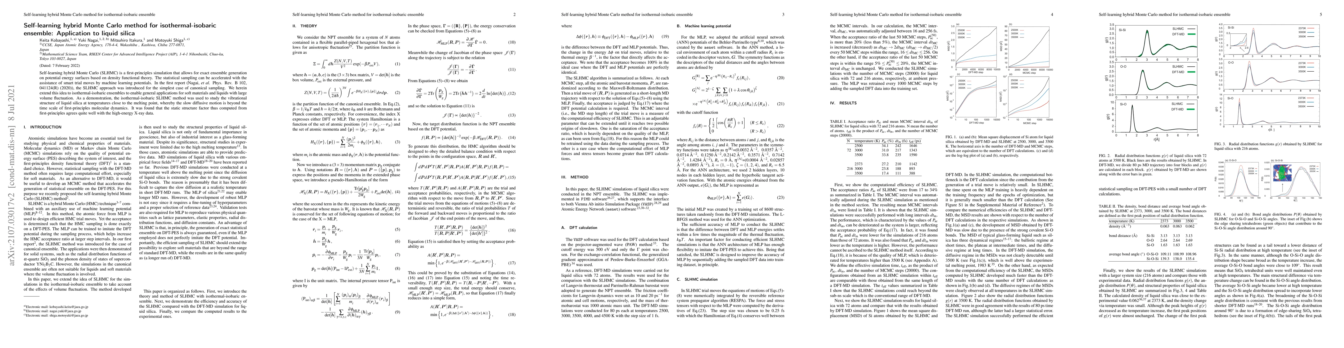This paper introduces a self-learning hybrid Monte Carlo method for isothermal-isobaric ensemble simulations, extending its application to study liquid silica. The results show good agreement between computed static structure factors and high-energy X-ray data, demonstrating the method's effectiveness for materials with significant volume fluctuations.
