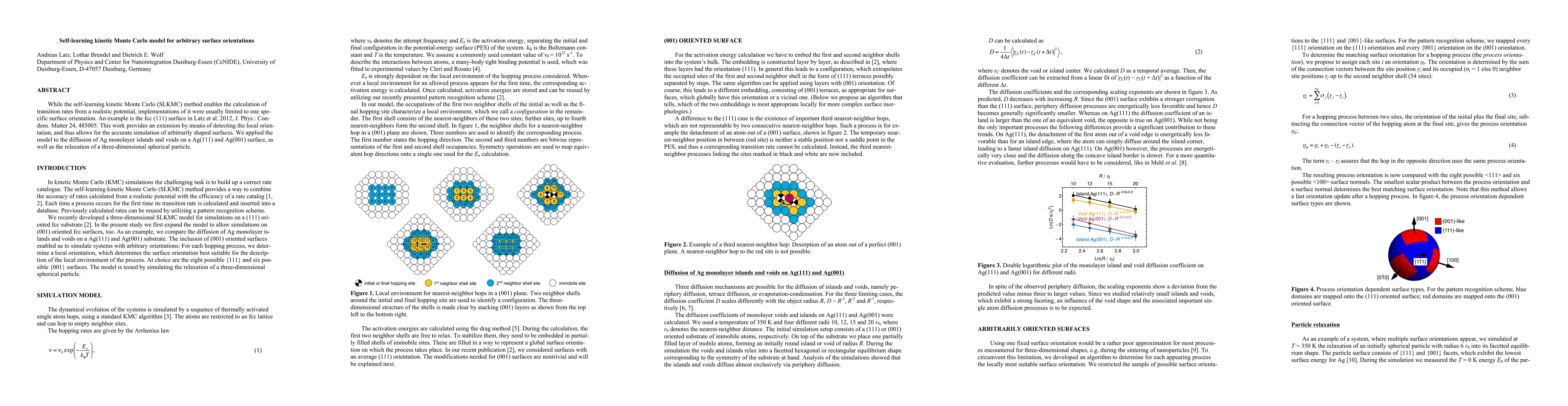 While the self-learning kinetic Monte Carlo (SLKMC) method enables the calculation of transition rates from a realistic potential, implementations of it were usually limited to one specific surface orientation. An example is the fcc (111) surface in Latz et al. 2012, J. Phys.: Condens. Matter 24, 485005. This work provides an extension by means of detecting the local orientation, and thus allows for the accurate simulation of arbitrarily shaped surfaces. We applied the model to the diffusion of Ag monolayer islands and voids on a Ag(111) and Ag(001) surface, as well as the relaxation of a three-dimensional spherical particle.