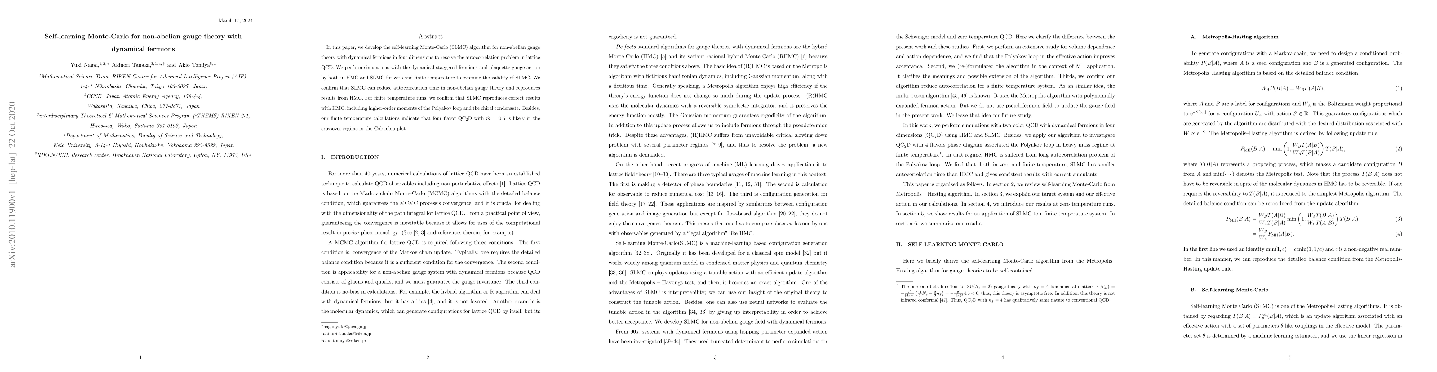 In this paper, we develop the self-learning Monte-Carlo (SLMC) algorithm for non-abelian gauge theory with dynamical fermions in four dimensions to resolve the autocorrelation problem in lattice QCD. We perform simulations with the dynamical staggered fermions and plaquette gauge action by both in HMC and SLMC for zero and finite temperature to examine the validity of SLMC. We confirm that SLMC can reduce autocorrelation time in non-abelian gauge theory and reproduces results from HMC. For finite temperature runs, we confirm that SLMC reproduces correct results with HMC, including higher-order moments of the Polyakov loop and the chiral condensate. Besides, our finite temperature calculations indicate that four flavor QC${}_2$D with $\hat{m} = 0.5$ is likely in the crossover regime in the Colombia plot.