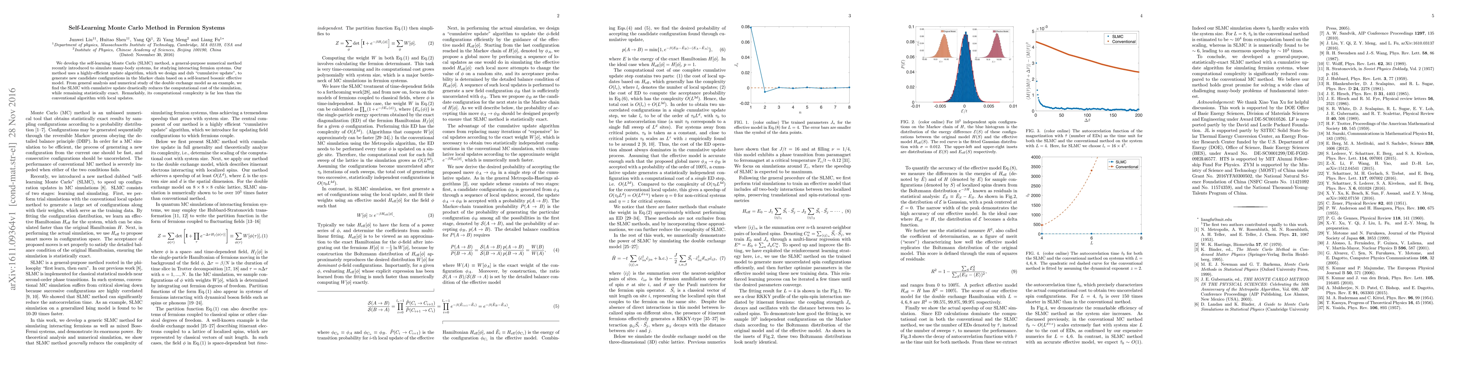The self-learning Monte Carlo (SLMC) method introduces a "cumulative update" algorithm to efficiently simulate interacting fermion systems, significantly reducing computational costs while maintaining statistical accuracy compared to conventional methods. This approach demonstrates substantial improvements in simulations, as evidenced by its application to the double exchange model.