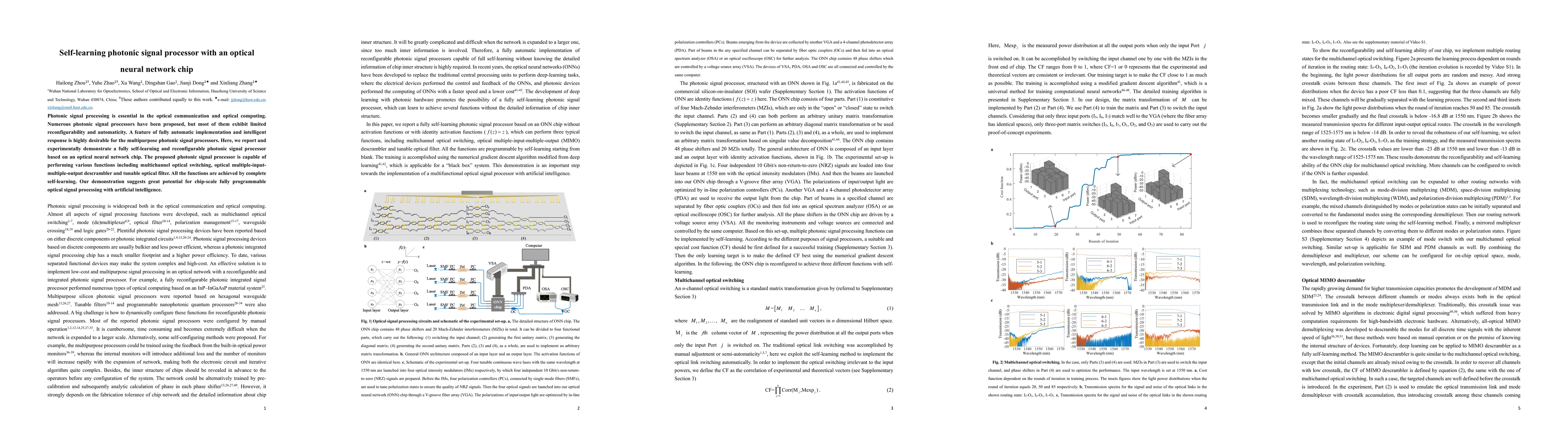 This paper presents a self-learning photonic signal processor based on an optical neural network chip that achieves automatic reconfigurability and intelligent response, enabling functions like multichannel optical switching and tunable optical filtering through complete self-learning. The demonstration highlights the potential for programmable, chip-scale optical signal processing using artificial intelligence.