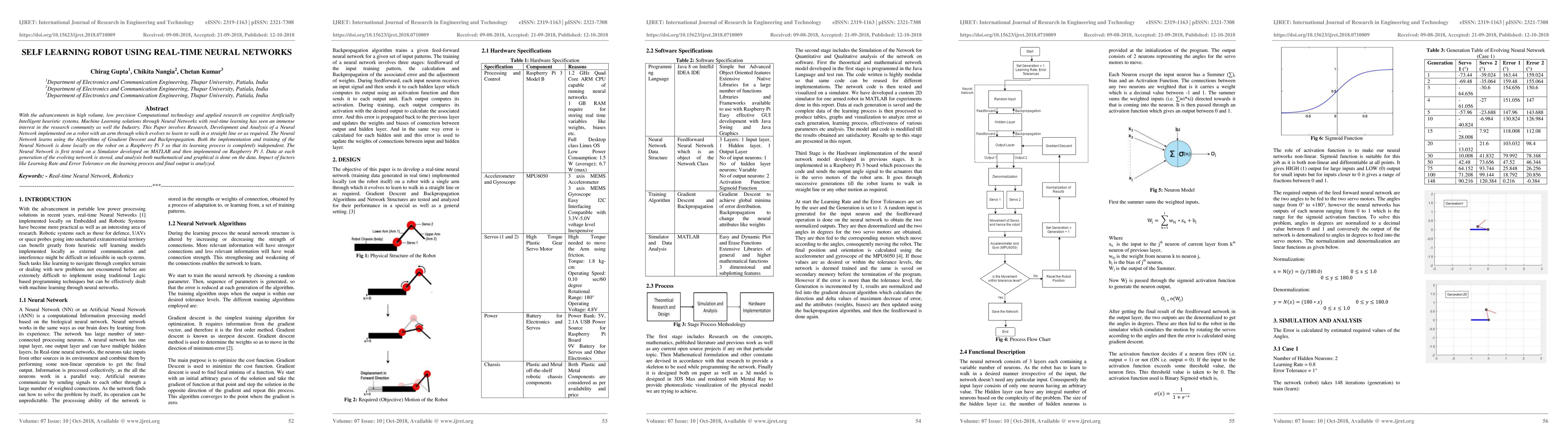 This research presents a self-learning robot utilizing real-time neural networks on a Raspberry Pi 3, enabling it to learn walking in a straight line through Gradient Descent and Backpropagation algorithms. The system's performance under varying learning rates and error tolerances is analyzed, showcasing the potential for autonomous, locally-trained AI systems.