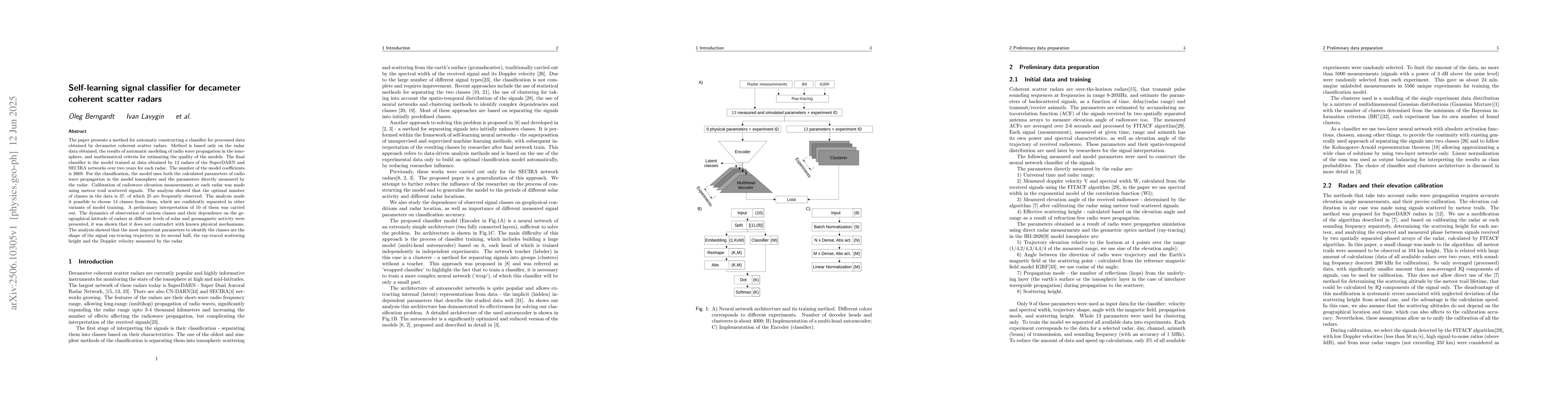 The paper presents a method for automatic constructing a classifier for processed data obtained by decameter coherent scatter radars. Method is based only on the radar data obtained, the results of automatic modeling of radio wave propagation in the ionosphere, and mathematical criteria for estimating the quality of the models. The final classifier is the model trained at data obtained by 12 radars of the SuperDARN and SECIRA networks over two years for each radar. The number of the model coefficients is 2669. For the classification, the model uses both the calculated parameters of radio wave propagation in the model ionosphere and the parameters directly measured by the radar. Calibration of radiowave elevation measurements at each radar was made using meteor trail scattered signals. The analysis showed that the optimal number of classes in the data is 37, of which 25 are frequently observed. The analysis made it possible to choose 14 classes from them, which are confidently separated in other variants of model training. A preliminary interpretation of 10 of them was carried out. The dynamics of observation of various classes and their dependence on the geographical latitude of radars at different levels of solar and geomagnetic activity were presented, it was shown that it does not contradict with known physical mechanisms. The analysis showed that the most important parameters to identify the classes are the shape of the signal ray-tracing trajectory in its second half, the ray-traced scattering height and the Doppler velocity measured by the radar.