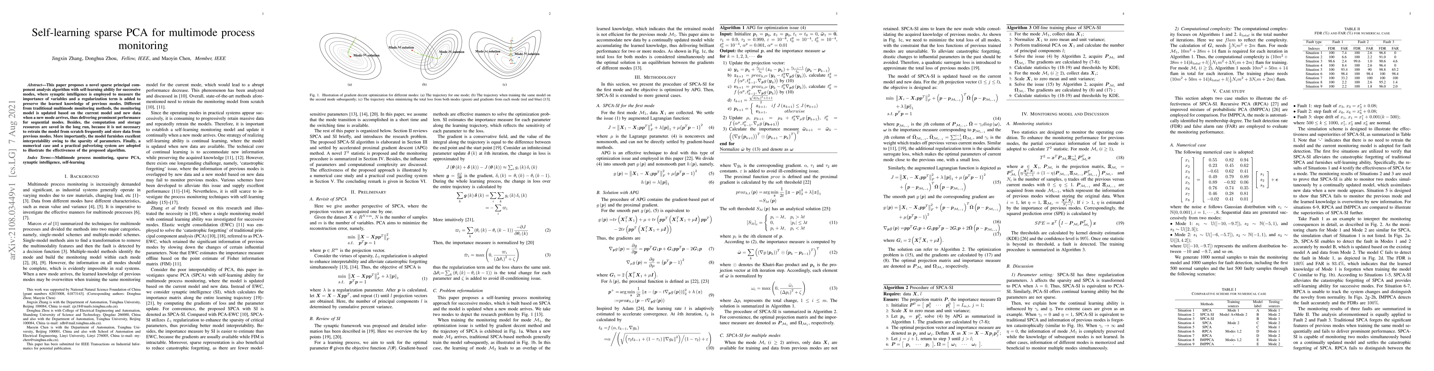 This paper proposes a novel sparse principal component analysis algorithm with self-learning ability for successive modes, where synaptic intelligence is employed to measure the importance of variables and a regularization term is added to preserve the learned knowledge of previous modes. Different from traditional multimode monitoring methods, the monitoring model is updated based on the current model and new data when a new mode arrives, thus delivering prominent performance for sequential modes. Besides, the computation and storage resources are saved in the long run, because it is not necessary to retrain the model from scratch frequently and store data from previous modes. More importantly, the model furnishes excellent interpretability owing to the sparsity of parameters. Finally, a numerical case and a practical pulverizing system are adopted to illustrate the effectiveness of the proposed algorithm.