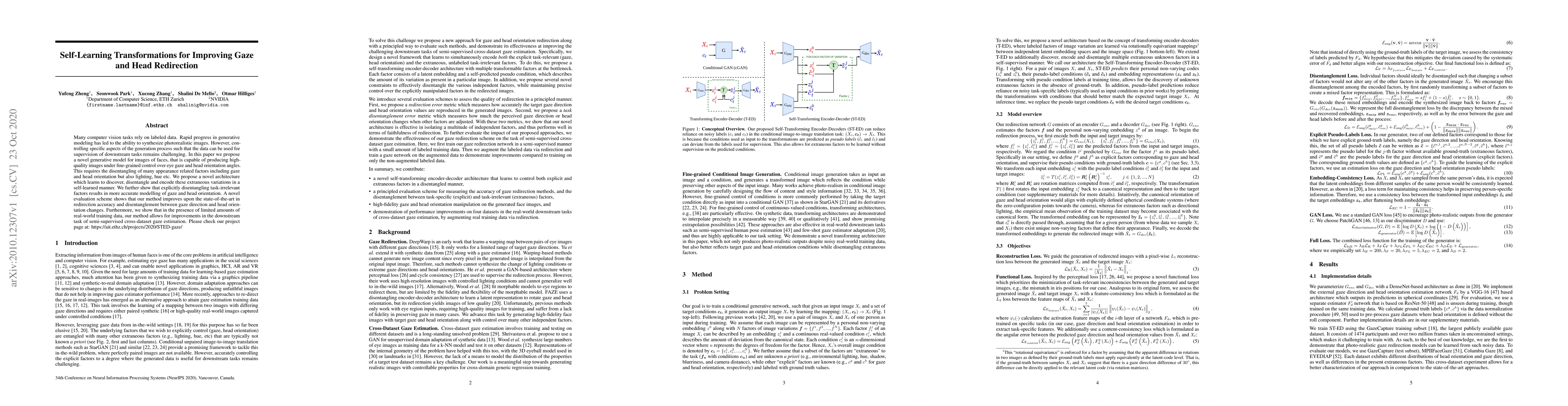 This paper introduces a generative model that can produce high-quality face images with precise control over eye gaze and head orientation, achieved through self-learning transformations to disentangle irrelevant factors. The proposed method outperforms existing techniques in gaze and head redirection accuracy and is effective even with limited real-world training data.