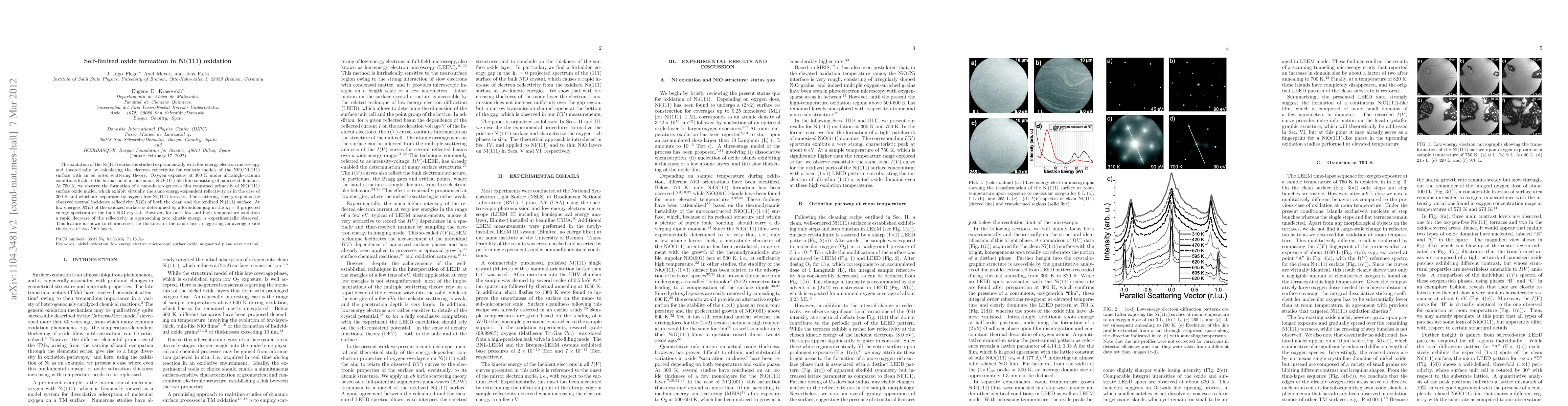 The oxidation of the Ni(111) surface is studied experimentally with low energy electron microscopy and theoretically by calculating the electron reflectivity for realistic models of the NiO/Ni(111) surface with an ab-initio scattering theory. Oxygen exposure at 300 K under ultrahigh-vacuum conditions leads to the formation of a continuous NiO(111)-like film consisting of nanosized domains. At 750 K, we observe the formation of a nano-heterogeneous film composed primarily of NiO(111)-like surface oxide nuclei, which exhibit virtually the same energy-dependent reflectivity as in the case of 300 K and which are separated by oxygen-free Ni(111) terraces. The scattering theory explains the observed normal incidence reflectivity R(E) of both the clean and the oxidized Ni(111) surface. At low energies R(E) of the oxidized surface is determined by a forbidden gap in the k_parallel=0 projected energy spectrum of the bulk NiO crystal. However, for both low and high temperature oxidation a rapid decrease of the reflectivity in approaching zero kinetic energy is experimentally observed. This feature is shown to characterize the thickness of the oxide layer, suggesting an average oxide thickness of two NiO layers.