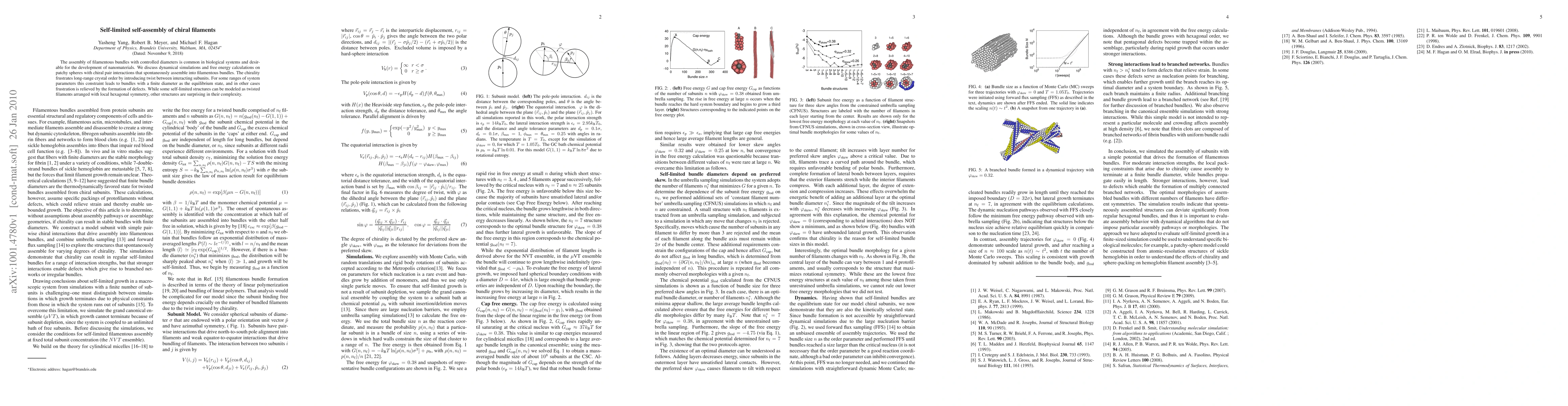 The assembly of filamentous bundles with controlled diameters is common in biological systems and desirable for the development of nanomaterials. We discuss dynamical simulations and free energy calculations on patchy spheres with chiral pair interactions that spontaneously assemble into filamentous bundles. The chirality frustrates long-range crystal order by introducing twist between interacting subunits. For some ranges of system parameters this constraint leads to bundles with a finite diameter as the equilibrium state, and in other cases frustration is relieved by the formation of defects. While some self-limited structures can be modeled as twisted filaments arranged with local hexagonal symmetry, other structures are surprising in their complexity.