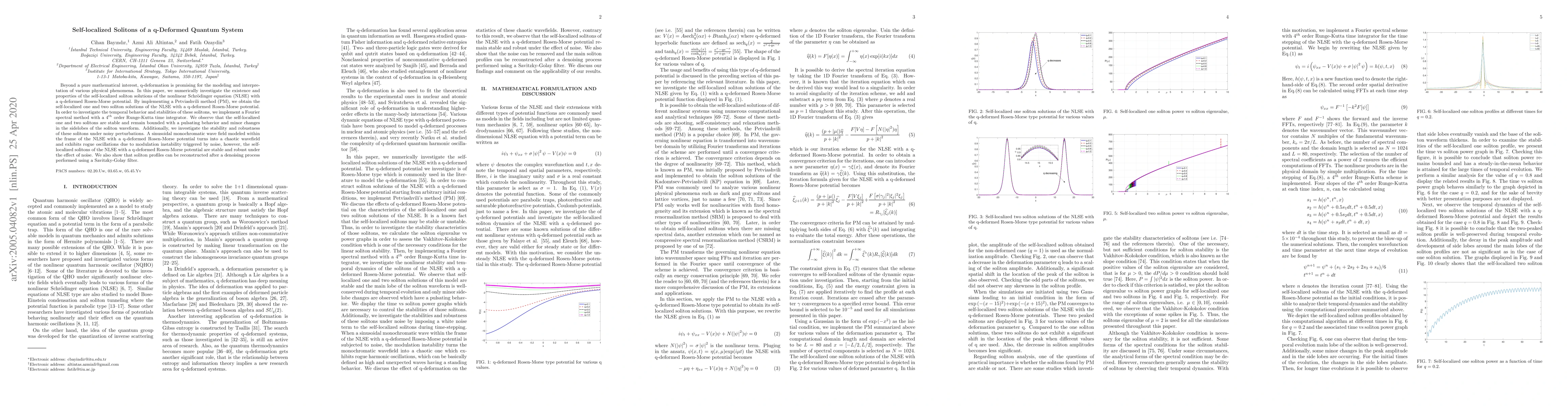 Beyond a pure mathematical interest, q-deformation is promising for the modeling and interpretation of various physical phenomena. In this paper, we numerically investigate the existence and properties of the self-localized soliton solutions of the nonlinear Schr\"{o}dinger equation (NLSE) with a q-deformed Rosen-Morse potential. By implementing a Petviashvili method (PM), we obtain the self-localized one and two soliton solutions of the NLSE with a q-deformed Rosen-Morse potential. In order to investigate the temporal behavior and stabilities of these solitons, we implement a Fourier spectral method with a $4^{th}$ order Runge-Kutta time integrator. We observe that the self-localized one and two solitons are stable and remain bounded with a pulsating behavior and minor changes in the sidelobes of the soliton waveform. Additionally, we investigate the stability and robustness of these solitons under noisy perturbations. A sinusoidal monochromatic wave field modeled within the frame of the NLSE with a q-deformed Rosen-Morse potential turns into a chaotic wavefield and exhibits rogue oscillations due to modulation instability triggered by noise, however, the self-localized solitons of the NLSE with a q-deformed Rosen-Morse potential are stable and robust under the effect of noise. We also show that soliton profiles can be reconstructed after a denoising process performed using a Savitzky-Golay filter.