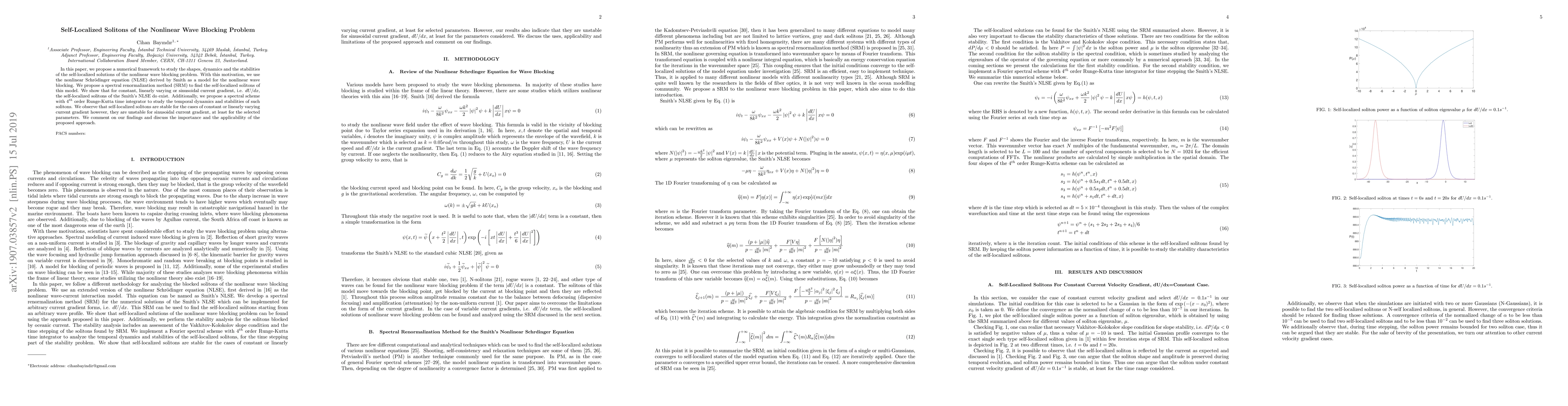 This paper presents a numerical framework using the nonlinear Schrödinger equation (NLSE) to study self-localized solitons in the nonlinear wave blocking problem. The spectral renormalization method (SRM) identifies these solitons for constant, linearly varying, or sinusoidal current gradients. Temporal dynamics reveal stable solitons for constant or linearly varying gradients but unstable ones for sinusoidal gradients, with implications for wave blocking phenomena.