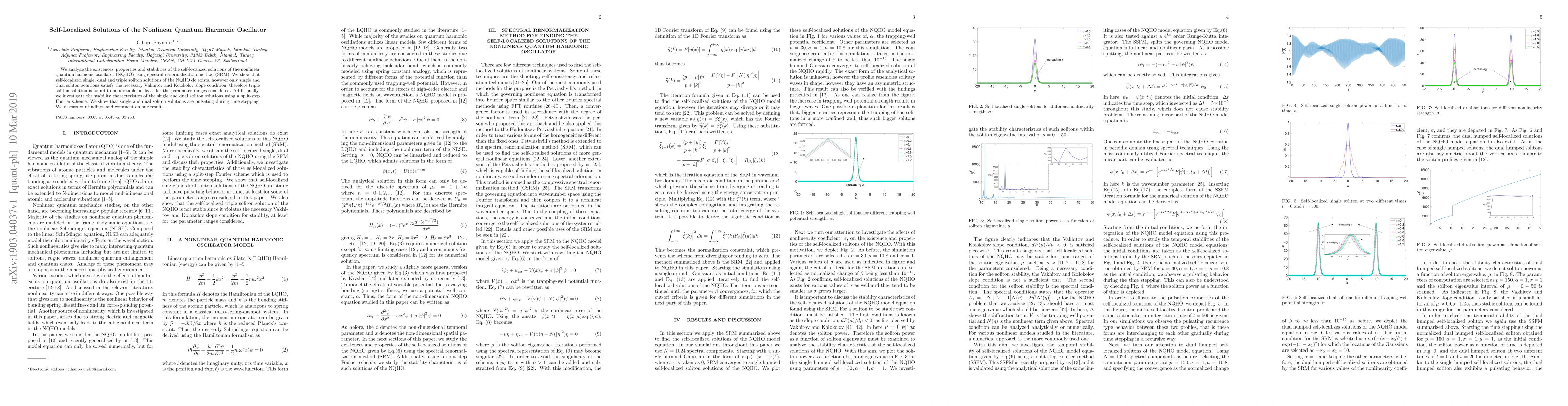 We analyze the existences, properties, and stabilities of the self-localized solutions of the nonlinear quantum harmonic oscillator (NQHO) using spectral renormalization method (SRM). We show that self-localized single, dual and triple soliton solutions of the NQHO do exists, however, only single and dual soliton solutions satisfy the necessary Vakhitov and Kolokolov slope condition, therefore triple soliton solution is found to be unstable, at least for the parameter ranges considered. Additionally, we investigate the stability characteristics of the single and dual soliton solutions using a split-step Fourier scheme. We show that single and dual soliton solutions are pulsating during time stepping. We discuss our findings and comment on our results.