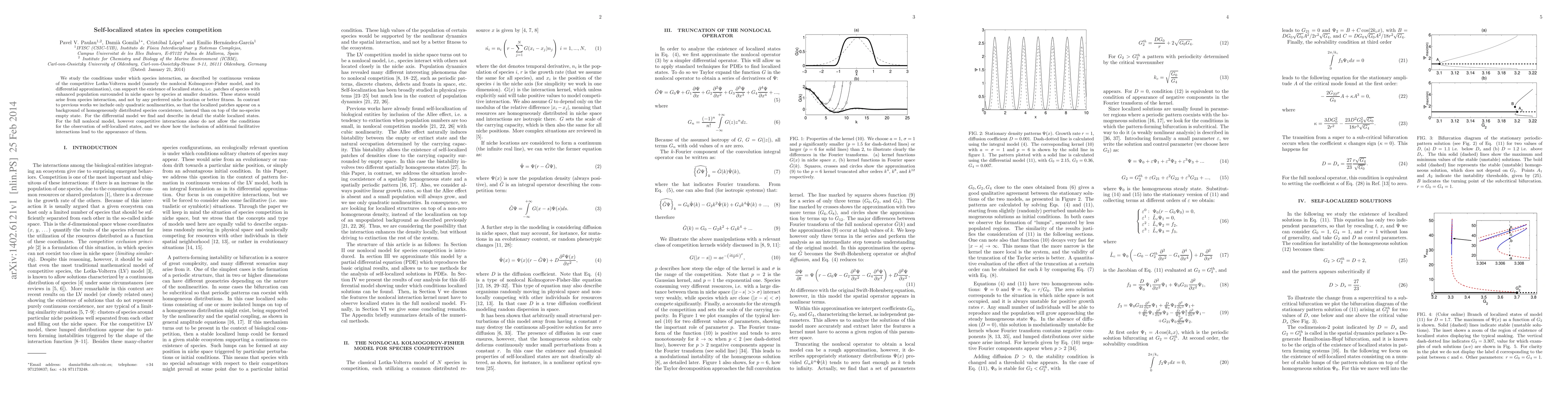 We study the conditions under which species interaction, as described by continuous versions of the competitive Lotka-Volterra model (namely the nonlocal Kolmogorov-Fisher model, and its differential approximation), can support the existence of localized states, i.e. patches of species with enhanced population surrounded in niche space by species at smaller densities. These states would arise from species interaction, and not by any preferred niche location or better fitness. In contrast to previous works we include only quadratic nonlinearities, so that the localized patches appear on a background of homogeneously distributed species coexistence, instead than on top of the no-species empty state. For the differential model we find and describe in detail the stable localized states. For the full nonlocal model, however competitive interactions alone do not allow the conditions for the observation of self-localized states, and we show how the inclusion of additional facilitative interactions lead to the appearance of them.