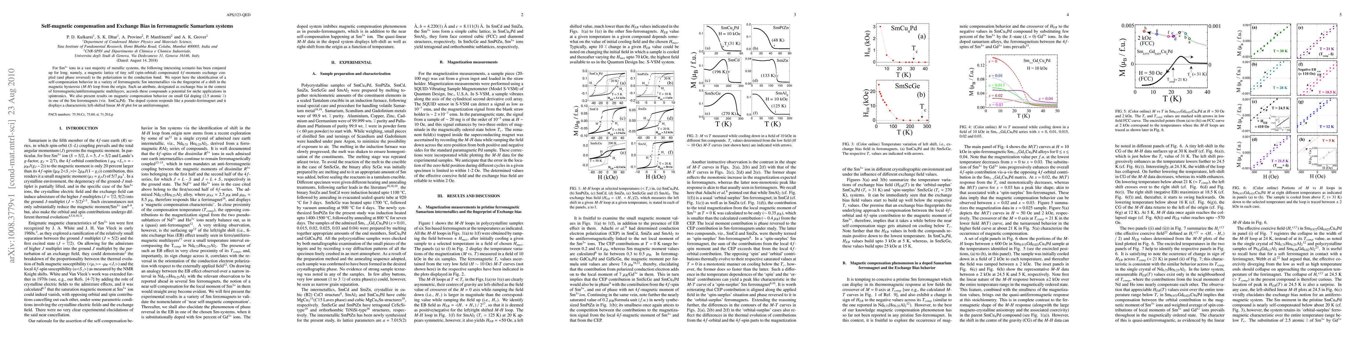 The paper identifies self-magnetic compensation and exchange bias in various ferromagnetic Sm intermetallics, recognized by a shift in magnetic hysteresis loops. This phenomenon, usually linked to ferromagnetic/antiferromagnetic multilayers, suggests potential applications in spintronics. Small Gd doping in one Sm ferromagnet creates a pseudo-ferrimagnetic system with left-shifted linear M-H plots, characteristic of antiferromagnets.