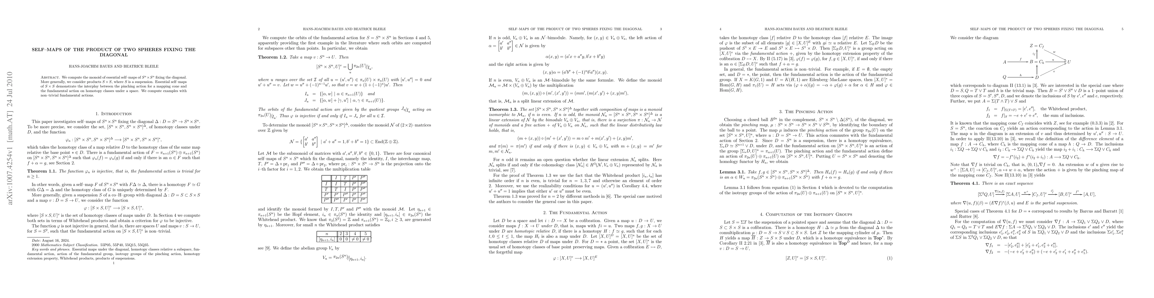 We compute the monoid of essential self-maps of of the product of two n-spheres fixing the diagonal. More generally, we consider products S x S, where S is a suspension. Essential self-maps of S x S demonstrate the interplay between the pinching action for a mapping cone and the fundamental action on homotopy classes under a space. We compute examples with non-trivial fundamental actions.