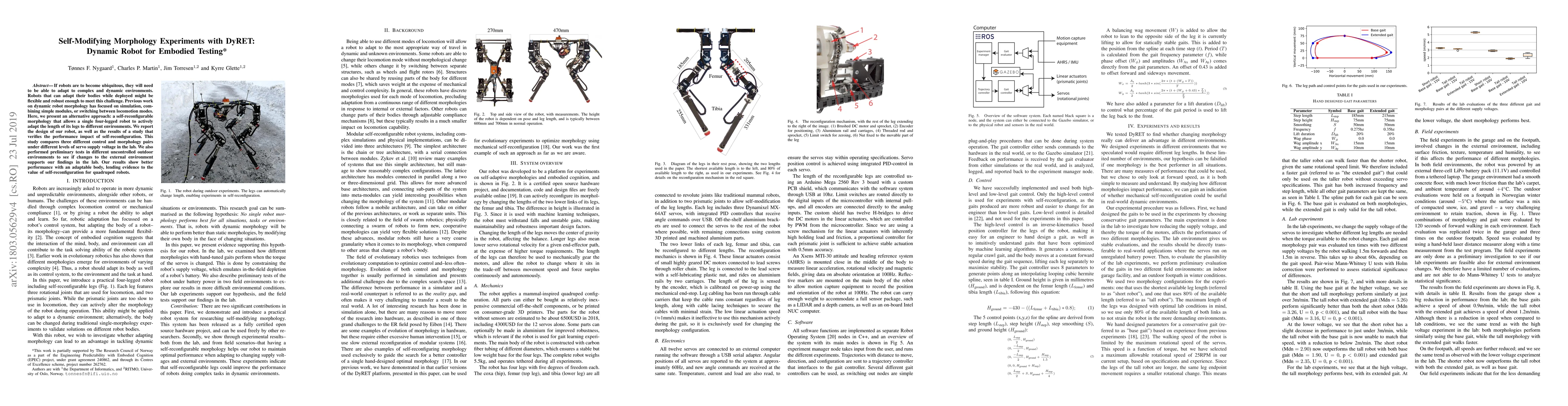 If robots are to become ubiquitous, they will need to be able to adapt to complex and dynamic environments. Robots that can adapt their bodies while deployed might be flexible and robust enough to meet this challenge. Previous work on dynamic robot morphology has focused on simulation, combining simple modules, or switching between locomotion modes. Here, we present an alternative approach: a self-reconfigurable morphology that allows a single four-legged robot to actively adapt the length of its legs to different environments. We report the design of our robot, as well as the results of a study that verifies the performance impact of self-reconfiguration. This study compares three different control and morphology pairs under different levels of servo supply voltage in the lab. We also performed preliminary tests in different uncontrolled outdoor environments to see if changes to the external environment supports our findings in the lab. Our results show better performance with an adaptable body, lending evidence to the value of self-reconfiguration for quadruped robots.