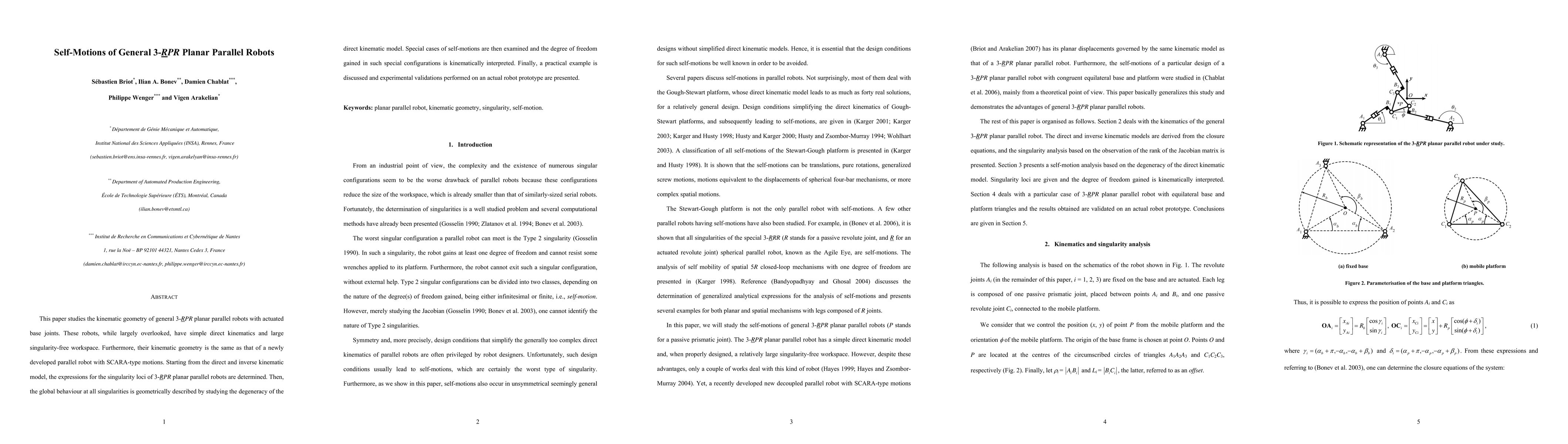 This paper investigates the kinematic geometry and singularity loci of general 3-RPR planar parallel robots, highlighting their simple direct kinematics and large singularity-free workspace. It also explores the self-motions and degree of freedom in special configurations, followed by experimental validation on a prototype.