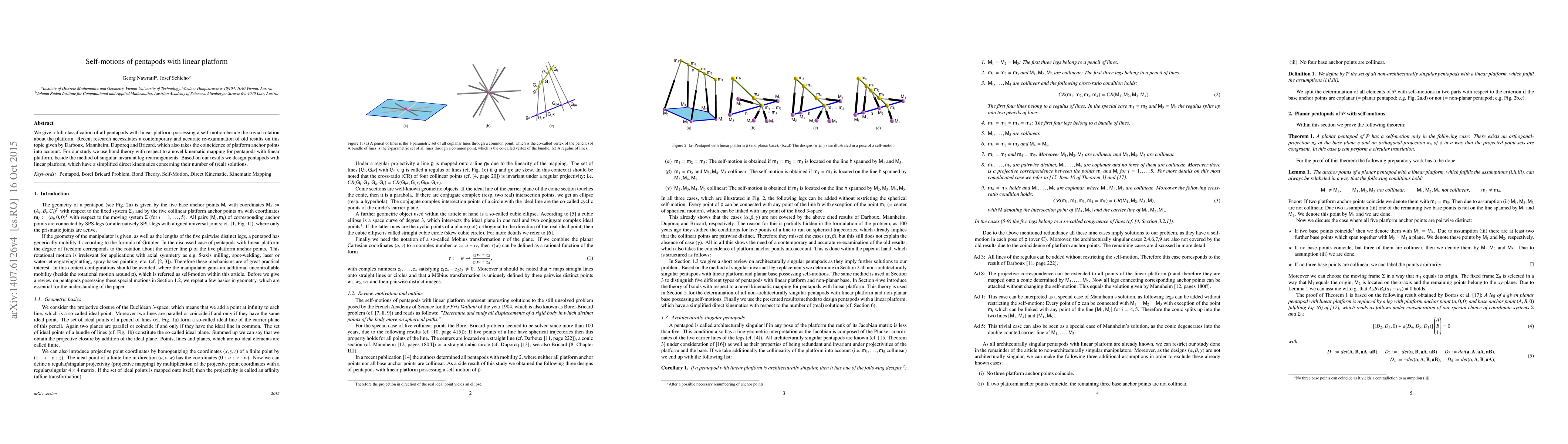 We give a full classification of all pentapods with linear platform possessing a self-motion beside the trivial rotation about the platform. Recent research necessitates a contemporary and accurate re-examination of old results on this topic given by Darboux, Mannheim, Duporcq and Bricard, which also takes the coincidence of platform anchor points into account. For our study we use bond theory with respect to a novel kinematic mapping for pentapods with linear platform, beside the method of singular-invariant leg-rearrangements. Based on our results we design pentapods with linear platform, which have a simplified direct kinematics concerning their number of (real) solutions.