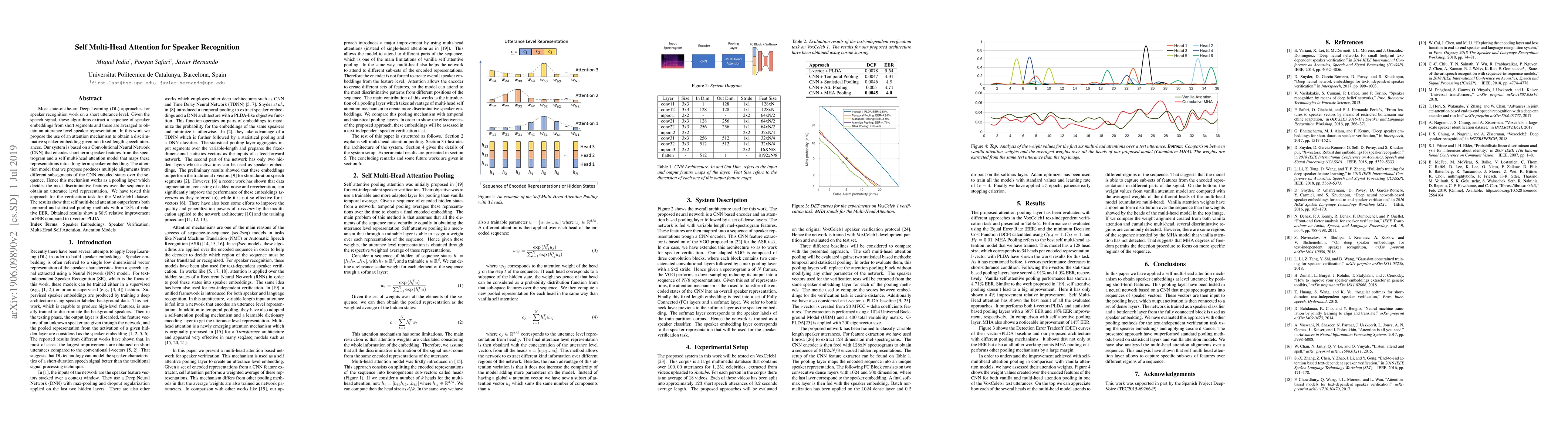 This paper proposes a self multi-head attention mechanism within a Convolutional Neural Network (CNN) to enhance speaker recognition for non-fixed length speech utterances. The model outperforms traditional pooling methods and achieves a significant 58% relative improvement in Equal Error Rate (EER) compared to i-vector+PLDA on the VoxCeleb1 dataset.