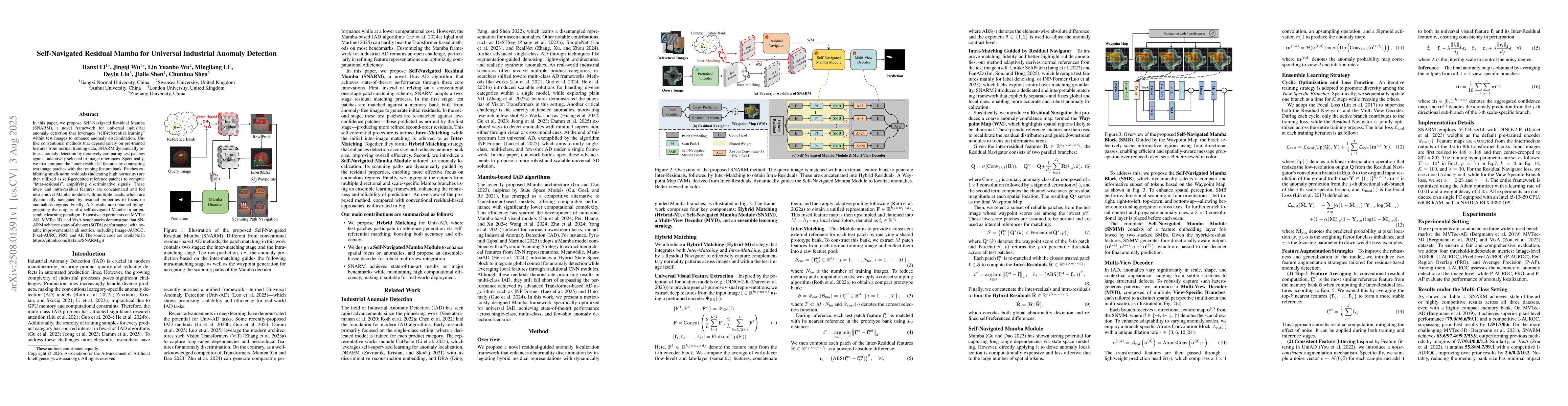 In this paper, we propose Self-Navigated Residual Mamba (SNARM), a novel framework for universal industrial anomaly detection that leverages ``self-referential learning'' within test images to enhance anomaly discrimination. Unlike conventional methods that depend solely on pre-trained features from normal training data, SNARM dynamically refines anomaly detection by iteratively comparing test patches against adaptively selected in-image references. Specifically, we first compute the ``inter-residuals'' features by contrasting test image patches with the training feature bank. Patches exhibiting small-norm residuals (indicating high normality) are then utilized as self-generated reference patches to compute ``intra-residuals'', amplifying discriminative signals. These inter- and intra-residual features are concatenated and fed into a novel Mamba module with multiple heads, which are dynamically navigated by residual properties to focus on anomalous regions. Finally, AD results are obtained by aggregating the outputs of a self-navigated Mamba in an ensemble learning paradigm. Extensive experiments on MVTec AD, MVTec 3D, and VisA benchmarks demonstrate that SNARM achieves state-of-the-art (SOTA) performance, with notable improvements in all metrics, including Image-AUROC, Pixel-AURC, PRO, and AP.