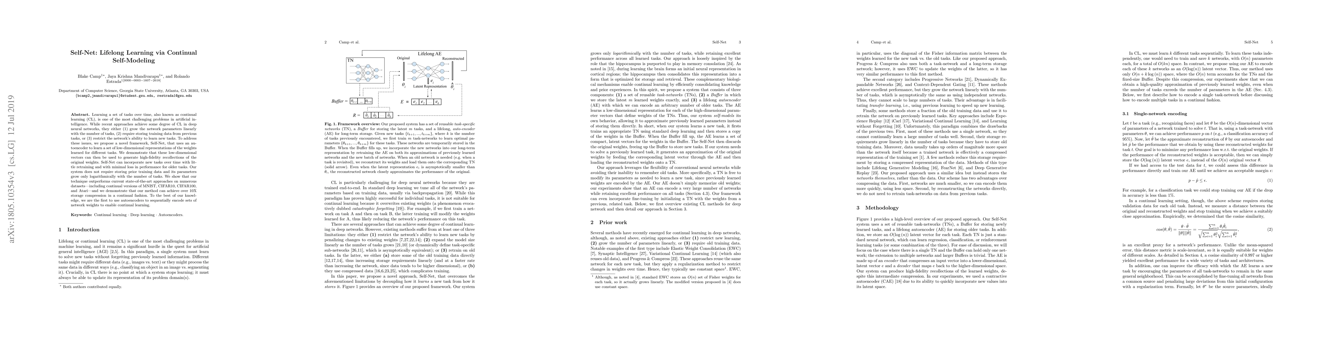Learning a set of tasks over time, also known as continual learning (CL), is one of the most challenging problems in artificial intelligence. While recent approaches achieve some degree of CL in deep neural networks, they either (1) grow the network parameters linearly with the number of tasks, (2) require storing training data from previous tasks, or (3) restrict the network's ability to learn new tasks. To address these issues, we propose a novel framework, Self-Net, that uses an autoencoder to learn a set of low-dimensional representations of the weights learned for different tasks. We demonstrate that these low-dimensional vectors can then be used to generate high-fidelity recollections of the original weights. Self-Net can incorporate new tasks over time with little retraining and with minimal loss in performance for older tasks. Our system does not require storing prior training data and its parameters grow only logarithmically with the number of tasks. We show that our technique outperforms current state-of-the-art approaches on numerous datasets---including continual versions of MNIST, CIFAR10, CIFAR100, and Atari---and we demonstrate that our method can achieve over 10X storage compression in a continual fashion. To the best of our knowledge, we are the first to use autoencoders to sequentially encode sets of network weights to enable continual learning.