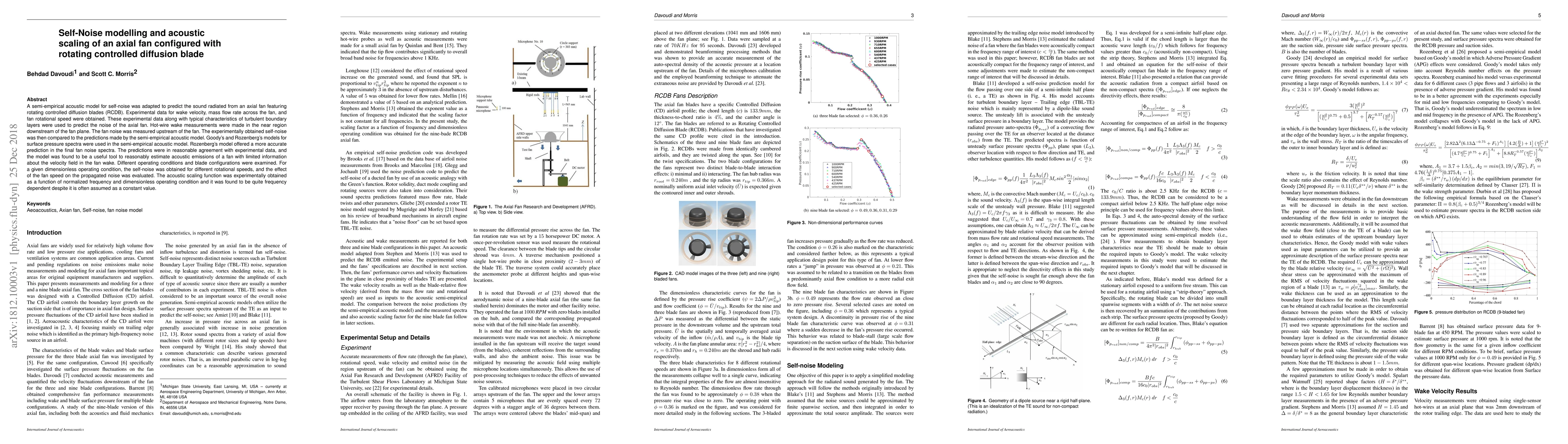 A semi-empirical acoustic model for self-noise was adapted to predict the sound radiated from an axial fan featuring rotating controlled diffusion blades (RCDB). Experimental data for wake velocity, mass flow rate across the fan, and fan rotational speed were obtained. These experimental data along with typical characteristics of turbulent boundary layers were used to predict the noise of the axial fan. Hot-wire wake measurements were made in the near region downstream of the fan plane. The fan noise was measured upstream of the fan. The experimentally obtained self-noise was then compared to the predictions made by the semi-empirical acoustic model. Goody's and Rozenberg's models for surface pressure spectra were used in the semi-empirical acoustic model. Rozenberg's model offered a more accurate prediction in the final fan noise spectra. The predictions were in reasonable agreement with experimental data, and the model was found to be a useful tool to reasonably estimate acoustic emissions of a fan with limited information about the velocity field in the fan wake. Different operating conditions and blade configurations were examined. For a given dimensionless operating condition, the self-noise was obtained for different rotational speeds, and the effect of the fan speed on the propagated noise was evaluated. The acoustic scaling function was experimentally obtained as a function of normalized frequency and dimensionless operating condition and it was found to be quite frequency dependent despite it is often assumed as a constant value.