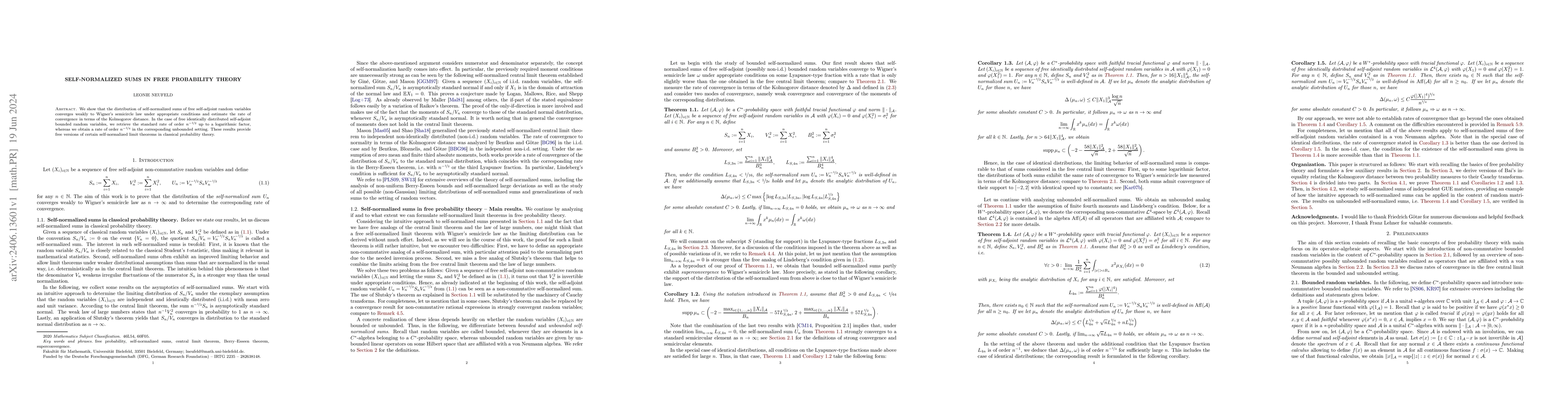 This paper demonstrates that self-normalized sums of free self-adjoint random variables converge to Wigner's semicircle law, estimating convergence rates in Kolmogorov distance; it finds $n^{-1/2}$ convergence for bounded variables and $n^{-1/4}$ for unbounded ones, mirroring classical self-normalized limit theorems.
