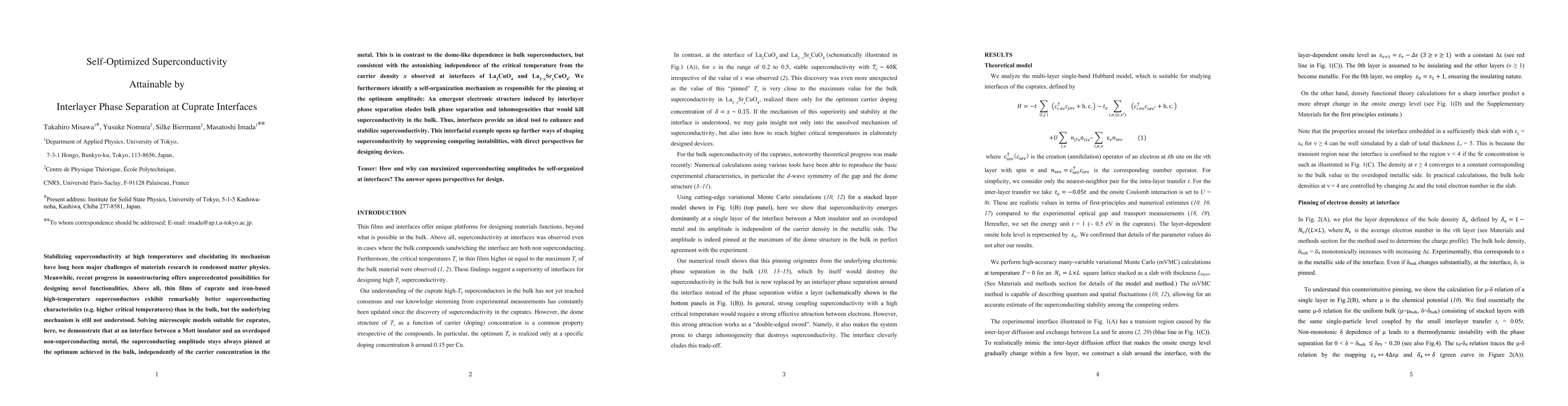 Stabilizing superconductivity at high temperatures and elucidating its mechanism have long been major challenges of materials research in condensed matter physics. Meanwhile, recent progress in nanostructuring offers unprecedented possibilities for designing novel functionalities. Above all, thin films of cuprate and iron-based high-temperature superconductors exhibit remarkably better superconducting characteristics (e.g. higher critical temperatures) than in the bulk, but the underlying mechanism is still not understood. Solving microscopic models suitable for cuprates, here, we demonstrate that at an interface between a Mott insulator and an overdoped non-superconducting metal, the superconducting amplitude stays always pinned at the optimum achieved in the bulk, independently of the carrier concentration in the metal. This is in contrast to the dome-like dependence in bulk superconductors, but consistent with the astonishing independence of the critical temperature from the carrier density x observed at interfaces of La2CuO4 and La2-xSrxCuO4. We furthermore identify a self-organization mechanism as responsible for the pinning at the optimum amplitude: An emergent electronic structure induced by interlayer phase separation eludes bulk phase separation and inhomogeneities that would kill superconductivity in the bulk. Thus, interfaces provide an ideal tool to enhance and stabilize superconductivity. This interfacial example opens up further ways of shaping superconductivity by suppressing competing instabilities, with direct perspectives for designing devices.