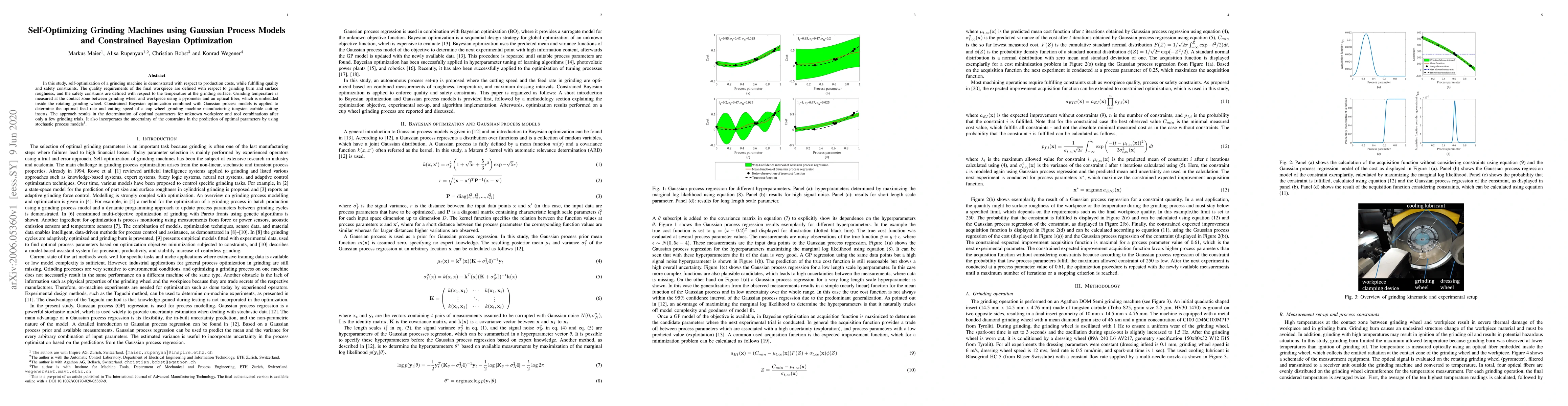 This paper presents a self-optimization method for grinding machines using Gaussian process models and constrained Bayesian optimization to minimize production costs while meeting quality and safety constraints. The method determines optimal feed rate and cutting speed for manufacturing tungsten carbide cutting inserts with minimal grinding burn and surface roughness, ensuring safe grinding temperatures.