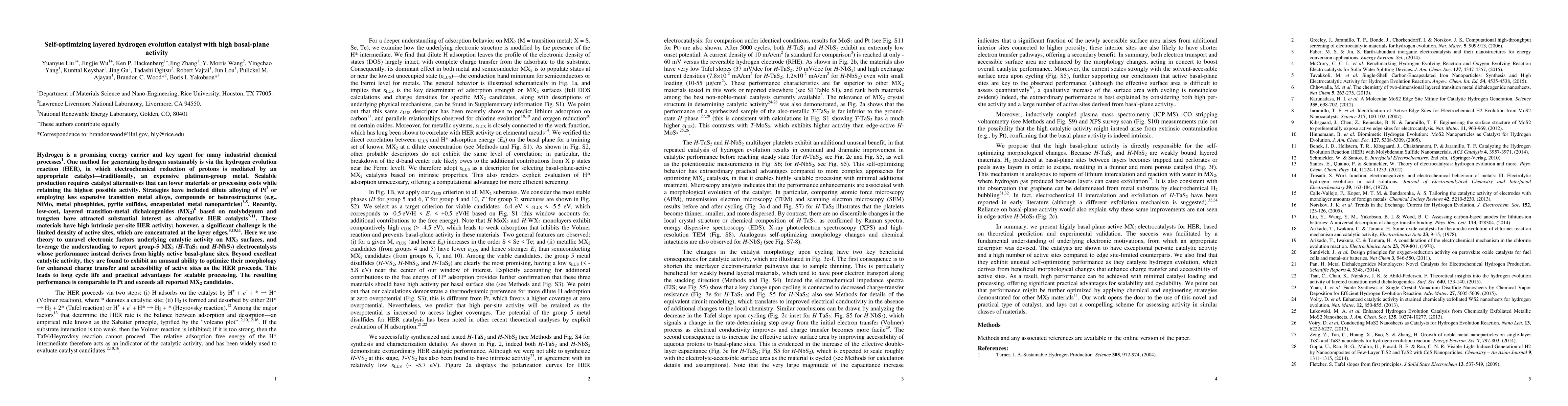 This paper presents self-optimizing layered hydrogen evolution catalysts based on group-5 transition metal dichalcogenides (H-TaS2 and H-NbS2) that exhibit high basal-plane activity, surpassing traditional edge-site activity. These materials optimize their morphology during the hydrogen evolution reaction, leading to enhanced charge transfer and long cycle life, making them a promising, cost-effective alternative to platinum-group metals.