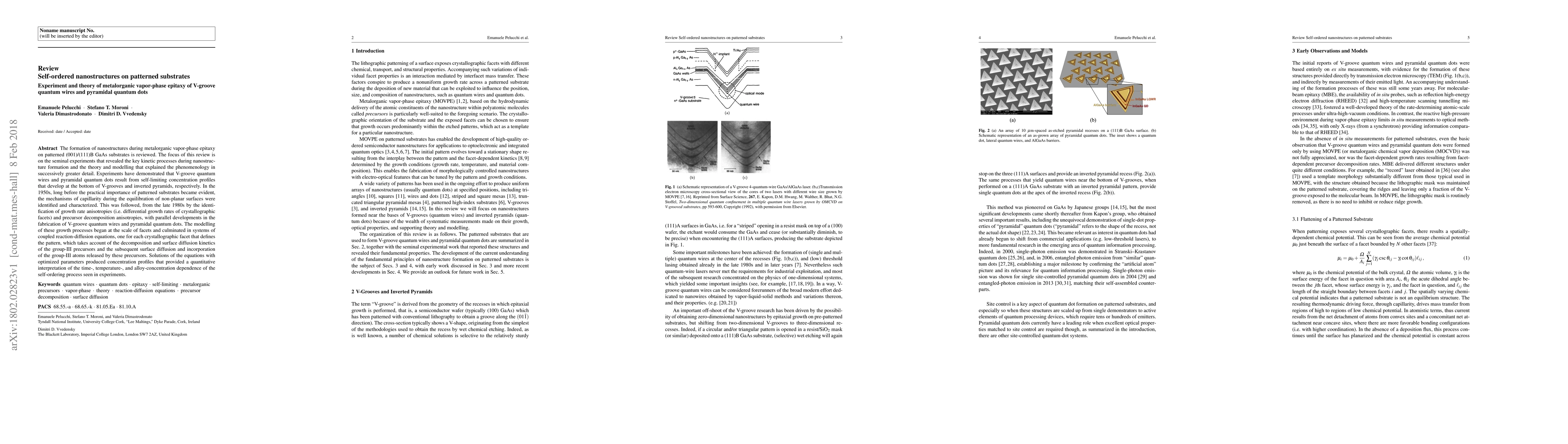 This paper reviews the formation of V-groove quantum wires and pyramidal quantum dots via metalorganic vapor-phase epitaxy on patterned GaAs substrates, detailing the key kinetic processes and theoretical models explaining the self-ordering phenomena observed. The study combines experimental findings and advanced reaction-diffusion modelling to elucidate the growth mechanisms.